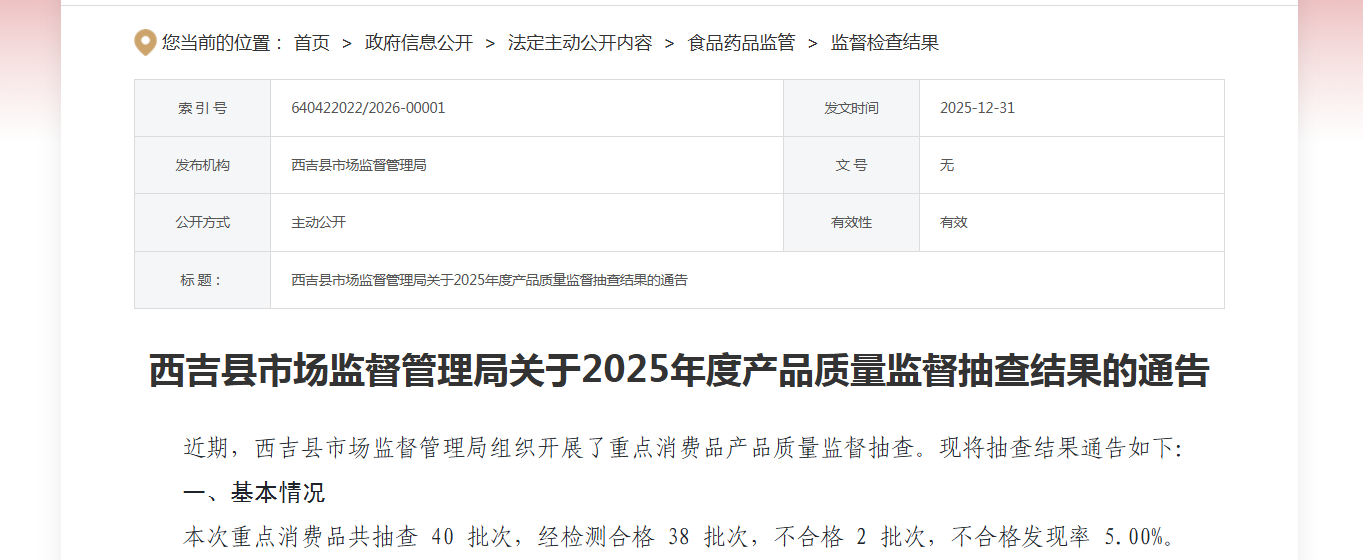 【宁夏】西吉县市场监督管理局公布2025年度产品质量监督抽查结果