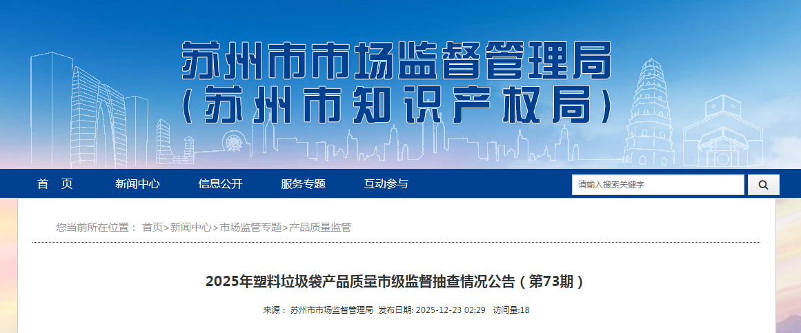 苏州市市场监督管理局发布2025年塑料垃圾袋产品质量市级监督抽查情况公告(第73期)