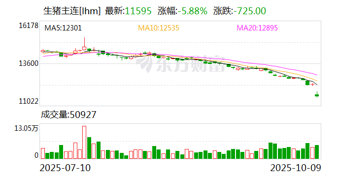 新华财经北京10月9日电(吴郑思)国庆中秋长假之后的首个交易日,与金银同步飙升同创历史新高形 成对比的是,生猪价格当日大幅"跳水"。截至10月9日收盘,生猪期货主力合约重挫近6%,将上市以来 新低刷新至12000元/吨下方。 市场普遍的分析几乎一致的将猪价重挫的原因归结为需求惯性回落和供应压力的集中释放。在此背景 下,生猪养殖企业多出现"以量补价"的局面。在供大于求格局短期难以改变的背景下,市场普遍预计猪 价弱势短时难有改变。不过,机构也提示,供应压力的集中释放或给远期猪价带来希望。 供应压力滚滚而来猪企"以量补价" 近两个月国内猪价出现加速下跌。盘面上看,尽管才走完一个完整的交易日,10月生猪期货加权价格月 度跌幅已经达到7.9%,而在9月份当月,生猪加权期价则累跌8.4%,为今年1月以来最大月度跌幅。作 为比较,7、8月生猪加权期价则分别上涨3.01%和下跌3.28%。 与猪价加速下跌走势相呼应的是国内生猪市场滚滚而来的出栏压力。据正信期货分析师介绍,虽然6-8 月大规模养殖主体出栏量大幅增加,但因基础供应偏少和中小规模主体压栏行为的影响,猪价并未出现 明显下跌。但进入9月,中小规模养殖主体的压栏开始集中 ...