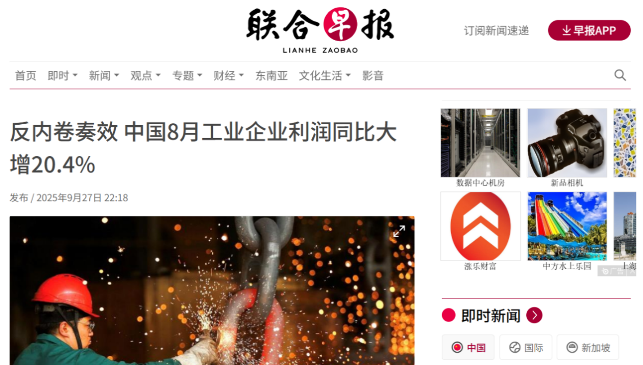 【环球网财经综合报道】日前,国家发改委、市场监管总局发布《关于治理价格无序竞争,维护良好市场价格秩序的公告》。针对部分产业出现的无序竞争 现象,《公告》提出调研评估行业平均成本、加强价格监管、规范招标投标行为等多项措施,释放维护公平竞争的明确信号。 国家统计局此前公布数据显示,1至8月中国规上工业企业实现利润总额4.69万亿元、同比增长0.9%,优于彭博社预期的下降1.6%,扭转了5月以来企业累计 利润持续下降的态势。对此《联合早报》近日以《反内卷奏效 中国8月工业企业利润同比大增20.4%》为题,撰文认为:"中国8月规模以上工业企业利润同 比大增20.4%,扭转了过去数月的下滑趋势,显示当局为解决产能过剩和过度竞争而采取的行动正在奏效。" 同时,综合路透社和彭博社报道,在中国大力治理产能过剩的背景下,官方此前公布的8月工业生产者出厂价格指数(PPI)同比下降2.9%,降幅较7月有所 收窄,工厂的通缩压力六个月来首次缓解。 报道还提到,中国国家统计局工业司首席统计师于卫宁表示,面对严峻复杂的外部环境、需求仍显不足的国内市场,下阶段要进一步扩大国内需求,推进全 国统一大市场建设,规范企业竞争秩序,为工业企业利润 ...