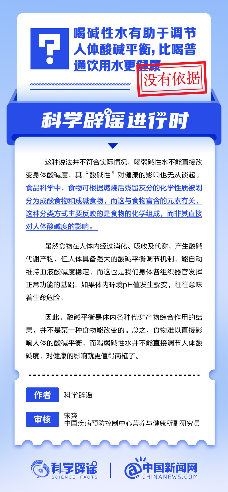 喝碱性水有助于调节人体酸碱平衡?丨中新真探 来源:中国新闻网 编辑:王永乐 中新网12月25日电 喝弱碱性水不能直接改变身体酸碱度,其"酸碱性"对健康的影响也无从谈起。食品科学中,食 物可根据燃烧后残留灰分的化学性质被划分为成酸食物和成碱食物,而这与食物富含的元素有关,这种分类方式 主要反映的是食物的化学组成,而非其直接对人体酸碱度的影响。#科学辟谣进行时#(来源:@科学辟谣 中国新 闻网微博) 广告等商务合作,请点击这里 本文为转载内容,授权事宜请联系原著作权人 中新经纬版权所有,未经书面授权,任何单位及个人不得转载、摘编或以其它方式使用。 关注中新经纬微信公众号(微信搜索"中新经纬"或"jwview"),看更多精彩财经资讯。 ...