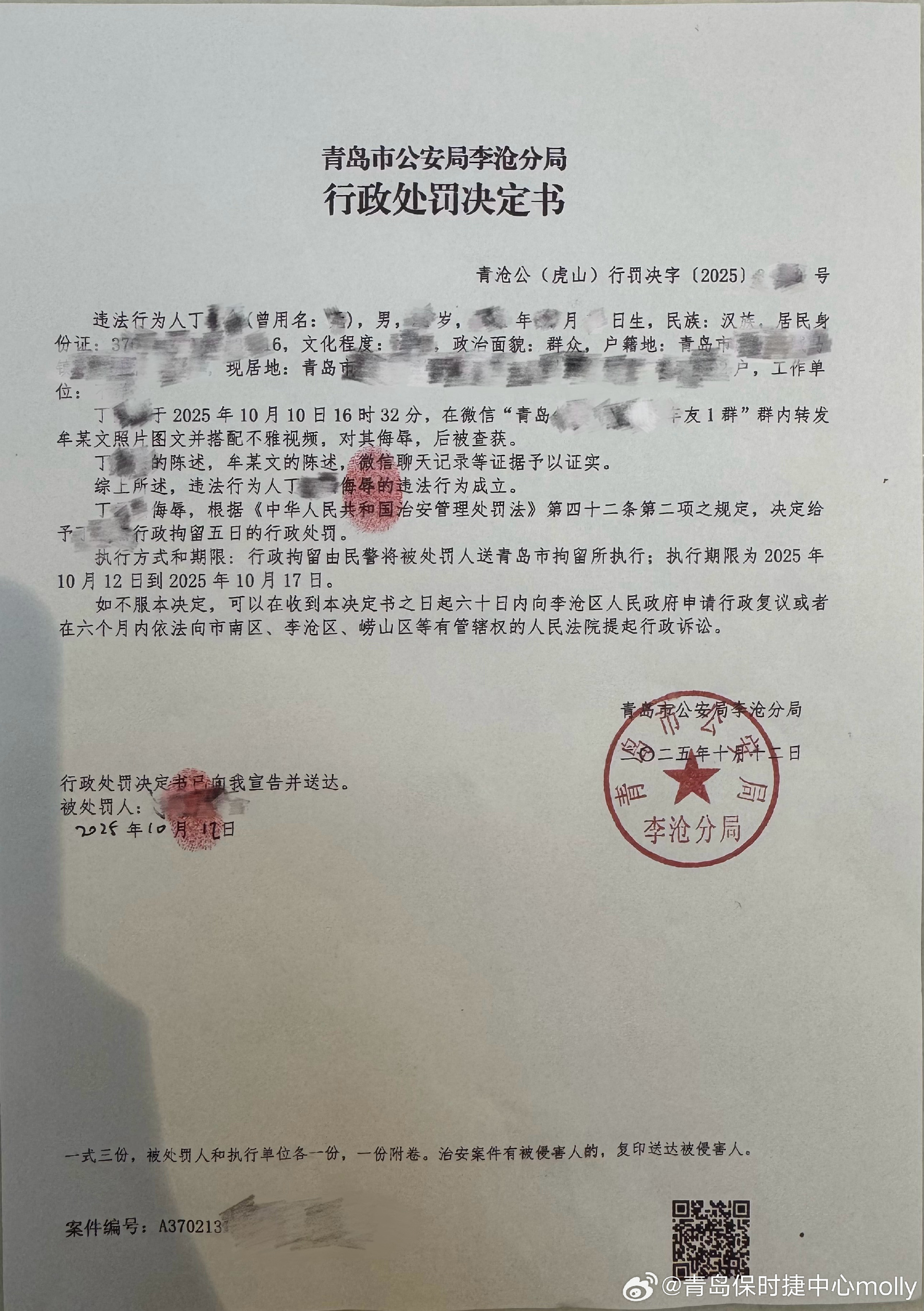 当"一键换脸"就能换来真金白银,违法成本与暴利收益之间的杠杆迅速失衡。 10月12日,青岛保时捷女销冠牟女士在个人微博账号晒出青岛市公安局李沧分局行政处罚决定书,并配文称,"网络不是法外之地,一切都有迹可循。" 事件起因据牟女士11日在微博描述:近期,网络上出现大量利用AI技术恶意合成的虚假视频以及与面部侧脸局部相似的不良视频,对牟女士进行诽谤与侮 辱,甚至肆意传播,泄露其电话及微信号,已对个人正常生活造成严重影响。牟女士严正声明:所有相关内容均为伪造,已委托律师完成证据固定,并于10 日晚向公安机关报案,启动法律程序追查到底。同时悬赏征集传播者证据。 12日牟女士发布的青岛市公安局李沧分局行政处罚决定书,主要是对违法行为链条中传播者丁某的处罚决定。决定书内容显示,2025年10月10日丁某在一微 信车友群内转发牟女士照片图文并搭配不雅视频,对其侮辱,后被查获。根据《中华人民共和国治安管理处罚法》第四十二条第二项规定,给予丁某行政拘 留五日的行政处罚。 违法行为人丁某在11日写下悔过书,承认自身错误并向牟女士道歉。但牟女士报案并启动法律程序追究所有涉案人员民事及刑事责任,直接进行AI合成图 文与视频的违法者暂 ...
