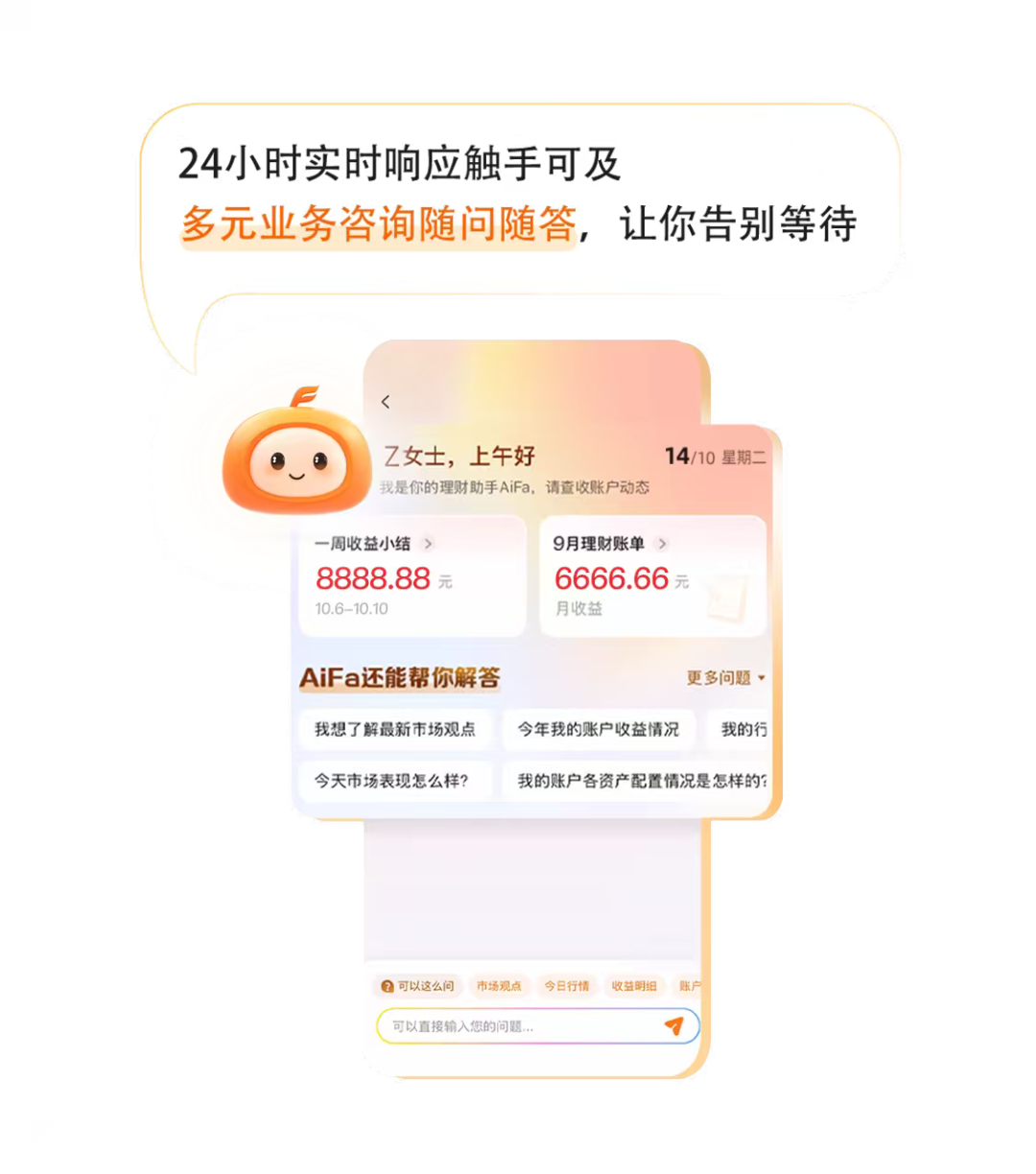 随着国产大模型技术不断突破,AI技术正迅速走进各行各业,财富管理领域也不例外。这场不断演进的技术革新,正在让理财服务变得更加触手可及。 线上理财凭借其便捷、高效的特点,成为众多投资者日常投资中不可或缺的重要组成部分。然而,线上理财平台由于服务人力有限,天然存在客户沟通服 务时效方面的瓶颈,为解决这一问题,广发基金借助AI技术能力,在公募基金公司中第一家推出对话式智能理财助理"AiFa",让"需求随时有响应"成为可 能。在突破沟通时效限制的同时,以专业的服务为投资者提供更多支持。 在设计初期,广发基金便确立了智能理财助理"AiFa"的三大核心定位:一是"7×24小时"不打烊,让投资者可以随时随地获得理财咨询服务;二是"更专 业、更懂你",深度融合大模型技术与内部数据资产,构建集需求识别及服务匹配于一体的基金理财服务Agent;三是发挥广发基金作为资产管理公司的专 业能力及全栈式AI能力,针对客户需求匹配合适方案。 广发基金相关业务负责人表示,"AiFa"作为智能理财搭档,以四大核心能力为投资者的财富之路保驾护航: 热点追踪,把握市场脉动。实时跟踪市场行情动态,解读热点投资机会,提供平台专业配置观点,助力投资者把 ...