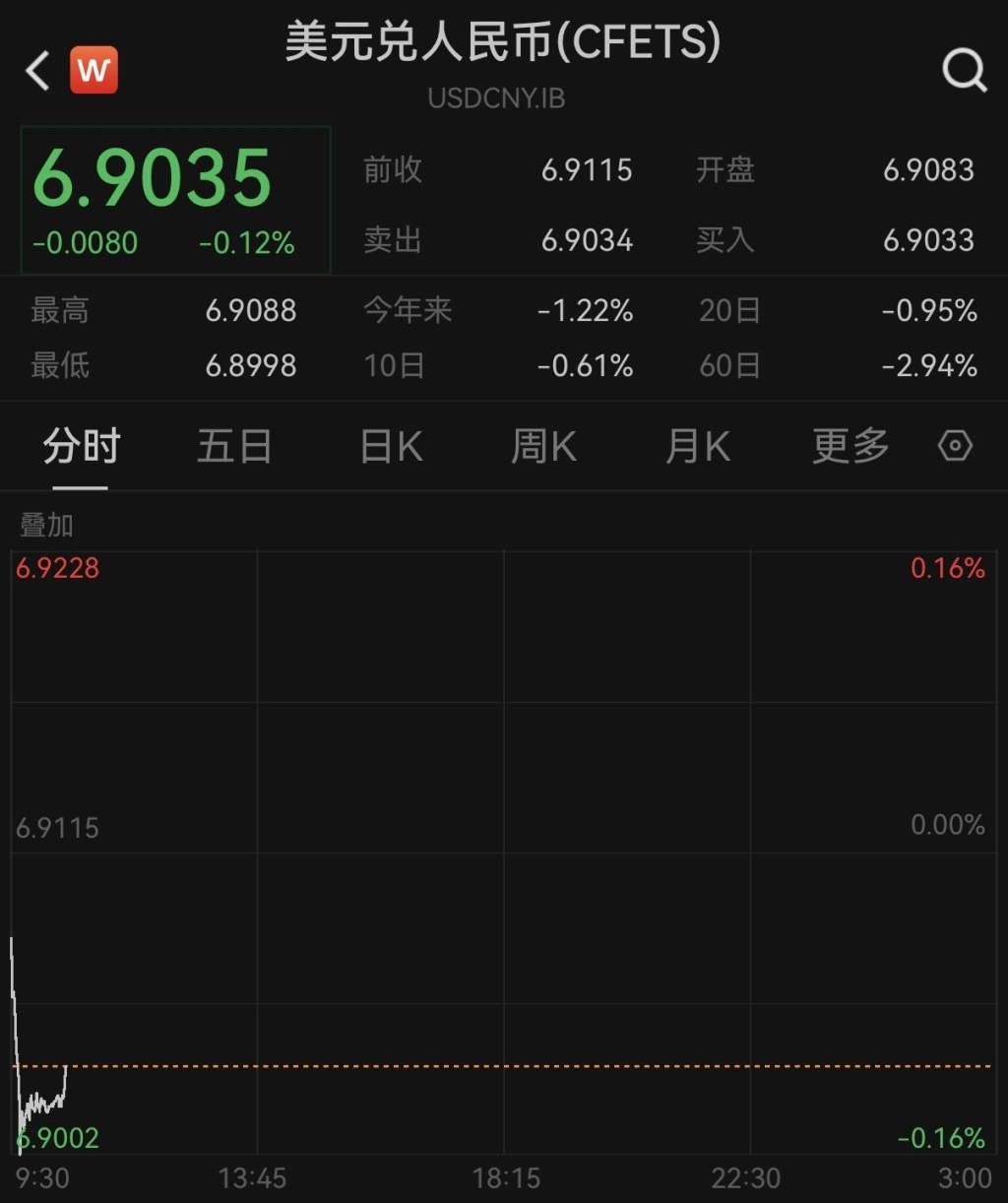 人民币对美元汇率升破6.90关口。 2月12日,人民币对美元即期汇率以6.9083开盘后走高,盘中升破6.90关口,截至发稿,盘中最高升至6.8998,创下2023年5月4日以来新高。 | < W | 美元兑人民币(CFETS) | | | | | | --- | --- | --- | --- | --- | --- | | | USDCNY.IB | | | | | | 6.9035 | | 前收 | 6.9115 | 开盘 | 6.9083 | | -0.0080 -0.12% | | 卖出 | 6.9034 | 买入 | 6.9033 | | 最高 | 6.9088 | 今年来。 | -1.22% | 20日 | -0.95% | | 最低 | 6.8998 | 10日 | -0.61% | 60日 | -2.94% | | 分时 | 五日 目K | | 周K | 目K | ■名 ○ | | 暨加 | | | | | | | 6.9228 | | | | | 0.16% | | 6.9115 | | | | | 0.00% | | 6.9002 9:30 | | | | | -0.16% | | | ...