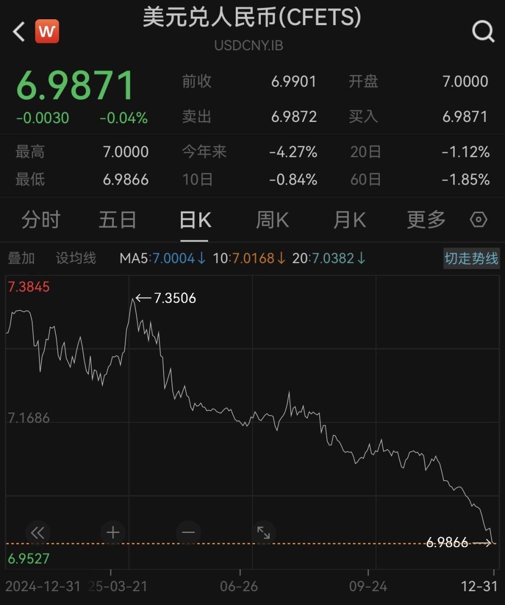 在岸人民币对美元升破7.0,创2023年5月以来新高