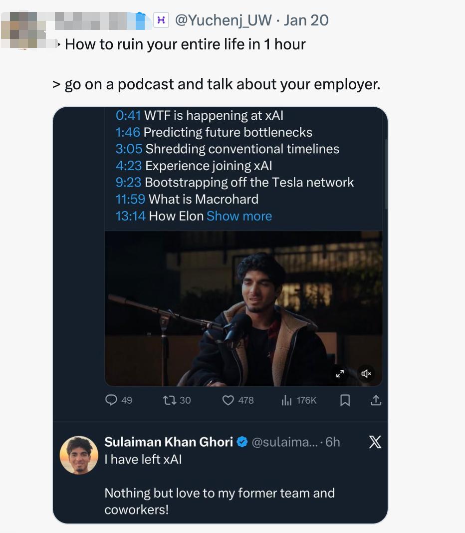 Sulaiman Ghori 在一期播客中,用了一个多小时详细讲述了他在 xAI 的经历。他说,在那里"从来没有人对我说不",每个人都被充分 信任去做正确的事;只要是好想法,当天就能落地、当天就能得到反馈。他还提到,马斯克愿意被证明是错的,只要你能拿出实验 数据。 他也坦言,在上一家公司,很多事情也许他一个人能做得更快;但在 xAI,整体反而更快,因为几乎没有官僚流程。这些话,听起 来都是对公司的认同和马斯克的赞扬,实际上他还说自己是马斯克粉丝。 然后,播客发出来后第 3 天,他被解雇了。 外界猜测是因为他说了太多敏感信息。节目中,他透露了利用闲置特斯拉汽车驱动的人类模拟器 AI 代理的计划、还有马斯克如何快 速构建 Colossus 超级集群、xAI 在模型策略上的核心决策,曝光了公司内部部署测试的 AI 虚拟员工等,还有 xAI 也被完全曝光。他 坦率地谈到了激进的时间表、马斯克亲自参与的 Cybertruck 奖金计划、内部文化和运营方式以及一些非公开的策略,这些言论引发 了外界的强烈反响。 经历被玩梗:如何在 1 小时内毁掉你的一生,对应了最近 x 的爆文"如何在 1 小时内修复你的一生" Sulai ...