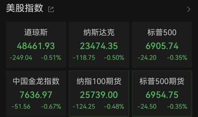 | 美股指数 它 | | | | --- | --- | --- | | 道琼斯 | 纳斯达克 | 标普500 | | 48461.93 | 23474.35 | 6905.74 | | -249.04 -0.51% | -118.75 -0.50% | -24.20 -0.35% | | 中国金龙指数 | 纳指100期货 | 标普500期货 | | 7636.97 | 25739.00 | 6954.75 | | -51.56 -0.67% | -124.25 -0.48% | -24.50 -0.35% | 据新华国际消息,受投资者获利回吐、短期期货交易者多头平仓影响,国际黄金、白银期货价格29日大幅下跌,金价跌幅一度超过4.5%,银价跌幅一度 逼近9%。截至发稿时,金价为每盎司4346.6美元,银价为每盎司71.54美元。 当地时间12月29日,美国三大股指全线收跌,道指跌0.51%,标普500指数跌0.35%,纳指跌0.5%。 美股大型科技股多数下跌,万得美国科技七巨头指数跌0.6%。个股方面,特斯拉跌超3%,英伟达跌超1%,亚马逊跌0.19%。 | W | 万得美国科技七巨头指数(MAGS) 667 ...