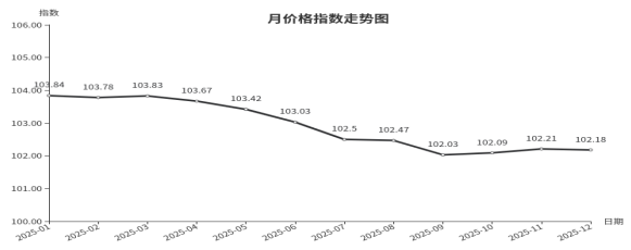 2025年12月份临沂商城月价格总指数为102.18点,环比下跌0.03点