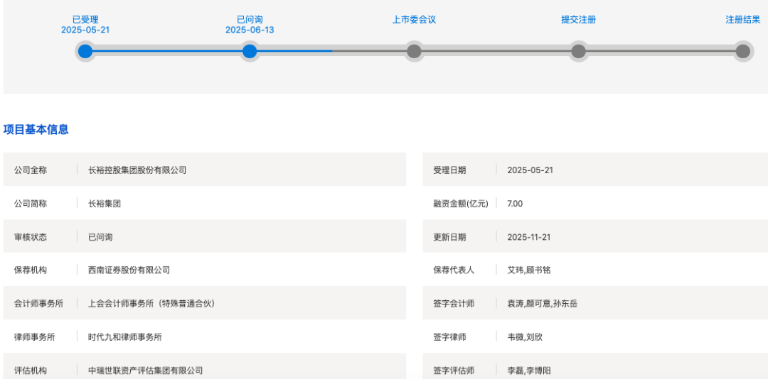 上交所网站显示,长裕控股集团股份有限公司(以下简称"长裕集团"或"发行人")于11月21日在上交所更新上市申请审核动态,该公司已回复第二轮审核 问询函,主要包括关于合并报表范围、行业代表性和会计处理等三大核心问题。 今年5月21日,长裕集团IPO获受理,保荐机构为西南证券。值得一提的是,在获受理近两个月,即今年7月,该公司被抽中现场检查。 | 公司全称 | 长裕控股集团股份有限公司 | 受理日期 | 2025-05-21 | | --- | --- | --- | --- | | 公司简称 | 长裕集团 | 融资金额(亿元) | 7.00 | | 审核状态 | 已问询 | 更新日期 | 2025-11-21 | | 保荐机构 | 西南证券股份有限公司 | 保荐代表人 | 艾玮,顾书铭 | | 会计师事务所 | 上会会计师事务所(特殊普通合伙) | 签字会计师 | 袁涛,颜可意,孙东岳 | | 律师事务所 | 时代九和律师事务所 | 签字律师 | 韦微,刘欣 | | 评估机构 | 中瑞世联资产评估集团有限公司 | 签字评估师 | 字磊,李博阳 | 据招股书,长裕集团主要从事锆类产品、特种尼龙产品、精细化工产品的 ...