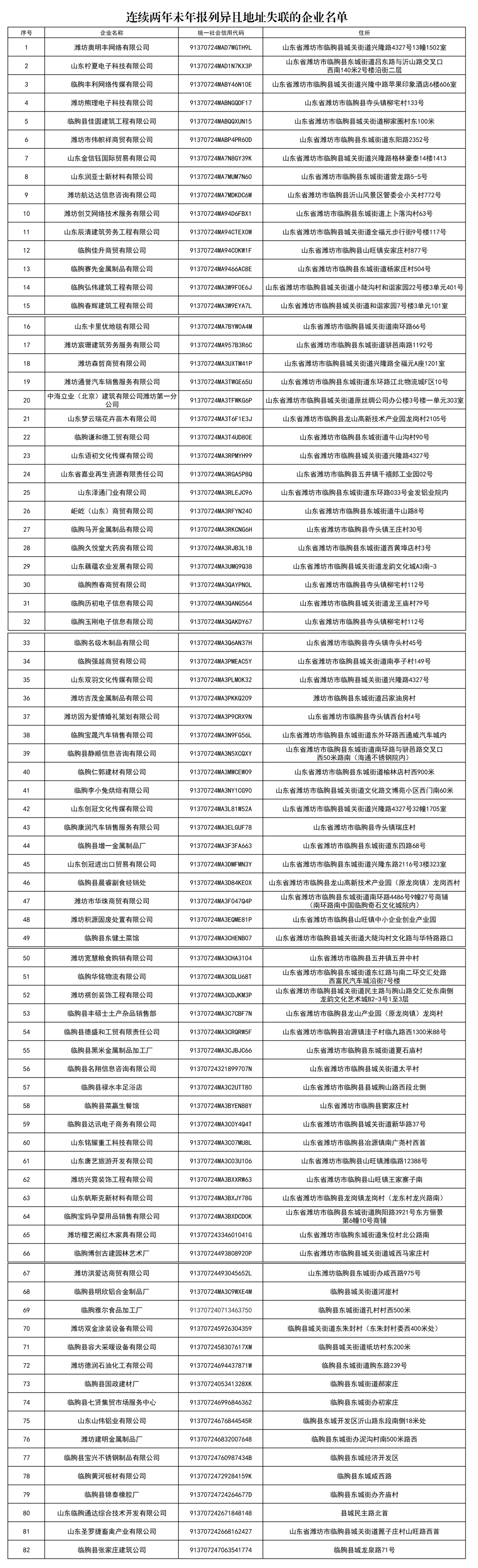 Group 1 - The Linqu County Market Supervision Administration will conduct a centralized cleanup of companies that have not submitted annual reports for two consecutive years and are listed in the business anomaly directory, with uncontactable registered addresses [1] - Companies listed in the "List of Enterprises with Two Years of Unreported Anomalies and Lost Addresses" must submit their annual reports and apply for credit restoration within 30 days of the announcement [1] - If companies fail to fulfill their reporting obligations by the deadline and cannot be contacted at their registered addresses, their business licenses will be revoked according to the regulations [1] Group 2 - A list of companies affected includes various entities such as Weifang Aomingfeng Network Co., Ltd. and Shandong Ningxia Electronic Technology Co., Ltd., among others, with specific addresses provided [2][3][4] - The list contains a total of 82 companies, indicating a significant number of businesses facing potential license revocation due to non-compliance [4]