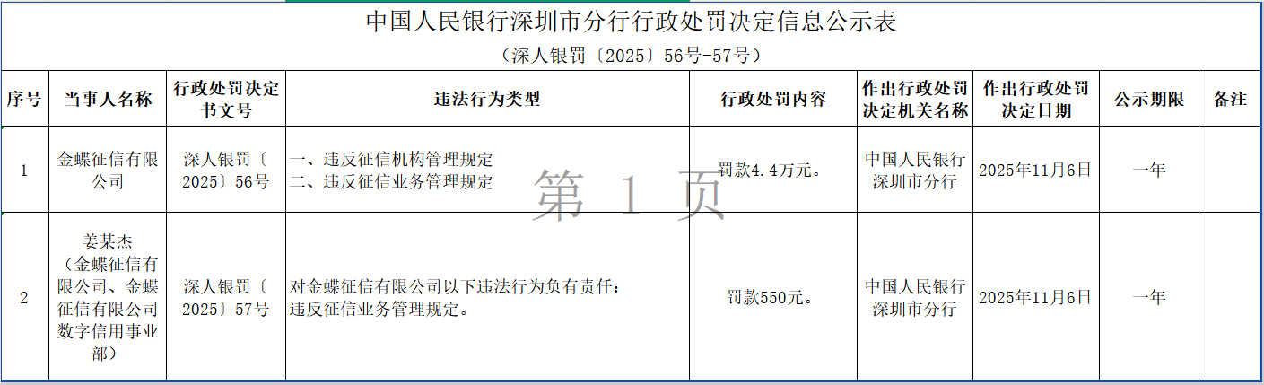 中国经济网北京11月25日讯 中国人民银行深圳市分行近期发布行政处罚决定信息公示表(深人银罚〔2025〕56号-57号)。金蝶征信有限公司存在以 下违法行为:一、违反征信机构管理规定;二、违反征信业务管理规定。中国人民银行深圳市分行决定对其处以罚款4.4万元。 姜某杰(金蝶征信有限公司、金蝶征信有限公司数字信用事业部)对金蝶征信有限公司以下违法行为负有责任:违反征信业务管理规定。中国人民银行 深圳市分行决定对其处以罚款550元。 | | | | | 中国人民银行深圳市分行行政处罚决定信息公示表 | | | --- | --- | --- | --- | --- | --- | | | | | | (深人银罚(2025) 56号-57号) | | | 序号 | 当事人名称 | 行政处罚决定 | 违法行为类型 | 行政处罚内容 | 作出行政处罚 | | | | 书文号 | | | 决定机关名称 | | | 金蝶征信有限 | 深人银罚 ( | 一、违反征信机构管理规定 | 罚款4.4万元。 | 中国人民银行 | | | 公司 | 2025) 56号 | 二、违反征信业务管理规定 | | 深圳市分行 | | | 姜某 ...