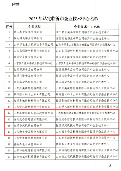 中国发展网讯近日,山东省临沂市发展改革委公布了2025年认定的临沂市企业技术中心、临沂市工程研 究中心名单,沂南5家企业成功申报。 下一步,沂南县将进一步引导和支持创新要素向企业集聚,引导企业加强技术创新投入,提升企业技术 创新能力和市场竞争力,为全县高质量发展提供有力支撑。(沂南县发展和改革局) | 序号 | 平台名称 | 单位名称 | | --- | --- | --- | | 23 | 高端空调支撑结构临沂市工程研究中心 | 临沂仕再新型建筑材料有限公 | | | | D | | 24 | 皮肤修复与组织再生临沂市工程研究中心 | 山东百奥科瑞生物工程有限公 司 | | ટરે | 橡胶特种功能助剂和电子级改性材脂临沂市工程 研究中心 | 山东锐巴新材料科技有限公司 | | 26 | 数智供应链协同创新临沂市工程研究中心 | 新勝(山东)供应链科技有限公 | | | | 8) | | 27 | 铝单板智能化成型临沂市工程研究中心 | 山东金杰利材料科技有限公司 | | 28 | AI 大模型数智化应用临沂工程研究中心 | 临沂呆马区块链网络科技有限 | | | | 公司 | | 29 | 输电线路智能勘 ...
