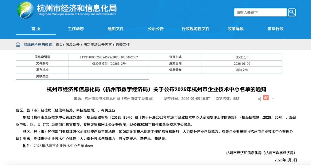 (来源:CSHIA) 近日,杭州市经济和信息化局正式发布2025年杭州市企业技术中心认定名单,地芯科技凭借在半导体领域的技术创新实力和研发体系建设成果,成功获 评"2025年杭州市企业技术中心"。 | | 信自化信 | | | | | | | | --- | --- | --- | --- | --- | --- | --- | --- | | | | | | | | 请输入关键字 | | | 首 页 | 工作动态 | 通知文件 | 公示公告 | | 行政规范性文件 | 政策解读 | 依法行政 | | (s | 您现在所在的位置: 首页> 信息公开 > 法定主动公开内容 > 通知文件 | | | | | | | | 信息索引号 | | 113301000024894529/2026-1010462567 | | 公开形式 | | 主动公开 | | | 文件编号 | | 杭经信技创〔2026〕2号 | | 成文日期 | | 2026-01-09 | | | 发布机构 关联类型 | | | | 信息分类 | | 通知文件 | | | 序号 | 企业技术中心名称 | 所属区县 | | --- | --- | --- ...