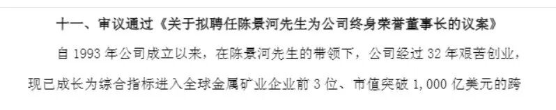 每日经济新闻消息,11月28日晚间,中国矿业巨头紫金矿业(SH601899,股价28.58元,市值7596亿 元)发布了一系列重磅公告。 紫金矿业于11月28日召开了董事会会议,审议通过了关于董事会换届选举的多项议案。 图片来源:紫金矿业公告截图 "陈景河先生将继续在重大战略决策、资源对接等方面为公司提供指导与支持,助力公司长期发展。"紫 金矿业表示。 陈景河的奋斗生涯,也是一部中国矿业波澜壮阔的奋斗史。自1993年以来,陈景河担任紫金矿业的主要 领导、董事长。他带领团队确立了"开发矿业,造福社会"的宗旨,提出了"绿色高技术超一流国际矿业 集团"的战略目标。 图片来源:紫金矿业公告截图 《每日经济新闻》记者注意到,最引人注目的消息莫过于,一手缔造了紫金帝国的"灵魂人物"、现年68 岁的陈景河,因年龄和家庭原因,提出不再接受公司第九届董事会董事候选人提名。 与此同时,一份由多位跟随陈景河征战多年的核心高管组成的第九届董事会候选人名单也随之出炉。 拟聘陈景河为终身荣誉董事长 在紫金矿业发布的公告中,一段关于陈景河去留的表述显得尤为温情且充满战略深意。 公告披露,因年龄和家庭原因,陈景河先生提出不再接受公司第九届董 ...