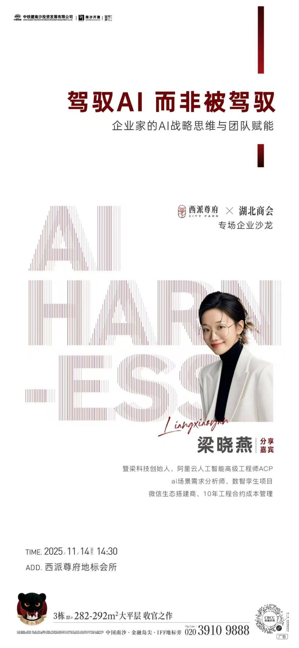 在人工智能不断重塑商业格局的当下,企业如何从"被动适应"走向"主动驾驭",已成为企业家必须面对的战略议题。2025年11月14日,一场 以"企业家的AI战略思维与团队赋能"为核心的高端沙龙,将于西派尊府地标会所举办,助力企业把握智能化转型的关键机遇。 据悉,西派尊府3栋产品作为收官之作,目前正全球争藏中。 诚邀各位企业家与管理精英莅临现场,共启AI时代的战略视野与团队赋能新篇章。 本次活动由西派尊府与乐居、湖北商会联合发起,特邀暨梁科技创始人、阿里云人工智能高级工程师ACP梁晓燕女士担任主讲。梁晓燕女 士在人工智能技术落地、生态搭建及成本管理领域拥有十年以上实战积累,她将从场景出发、以案例切入,为企业解读如何构建AI战略、 激活团队数字潜能,实现技术驱动下的组织进化与业务突破。 本次沙龙不仅是AI思维的碰撞平台,也是一次与城市塔尖圈层共话未来的交流契机。活动选址于西派国际生活美学样本——西派尊府地标 会所,该项目坐落于中国南方·金融岛头排,毗邻IEP国际住区,以"与世界为邻"的格局,打造约282-292㎡全球塔尖共鸣的舒居大平层。其 LDKB公区一体化、270°环幕视野、中西双厨配置及酒店式落客系统,重新定义 ...