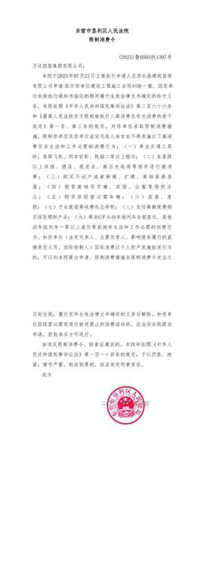 1月4日,东营市垦利区人民法院发布限制消费令,显示万达控股集团有限公司(简称"万达集团")及法 定代表人尚吉永被列为限制高消费对象。值得注意的是,这也是尚吉永首次被法院列为限制高消费对 象。 万达集团创建于1988年,2000年9月改制成立,曾名为东营市万达集团有限公司,业务涵盖原油开采、 港口码头、石油化工、国际贸易等板块,是东营最大的民营企业之一,多年入围中国企业500强、中国 民营企业500强。 尚吉永1968年出生,曾任胜坨福利综合厂会计。1994年,尚吉永等人带头创立山东万达机电集团股份有 限公司,该公司后成为万达集团核心子公司。目前,尚吉永担任万达集团法定代表人、董事长兼总经 理,持有万达集团40.68%股份,是公司控股股东、实际控制人。 《2025) 春0506长1397 号 万站按股集团有限公司: 本院于2025年07月23日立案执行申请人北京水晶建筑装饰 有限公司申请 我行你单位建设工程施工合同创设一案,因你单 在未按执行通知书程定的照明履行生质法律文书确定的给住义 条,学院依照《中华人民共和国民事诉讼法》第二百六十六条 和《最高人民法院关于照制建筑栏人高洲重及有关消费的若干 规定》第一条, ...