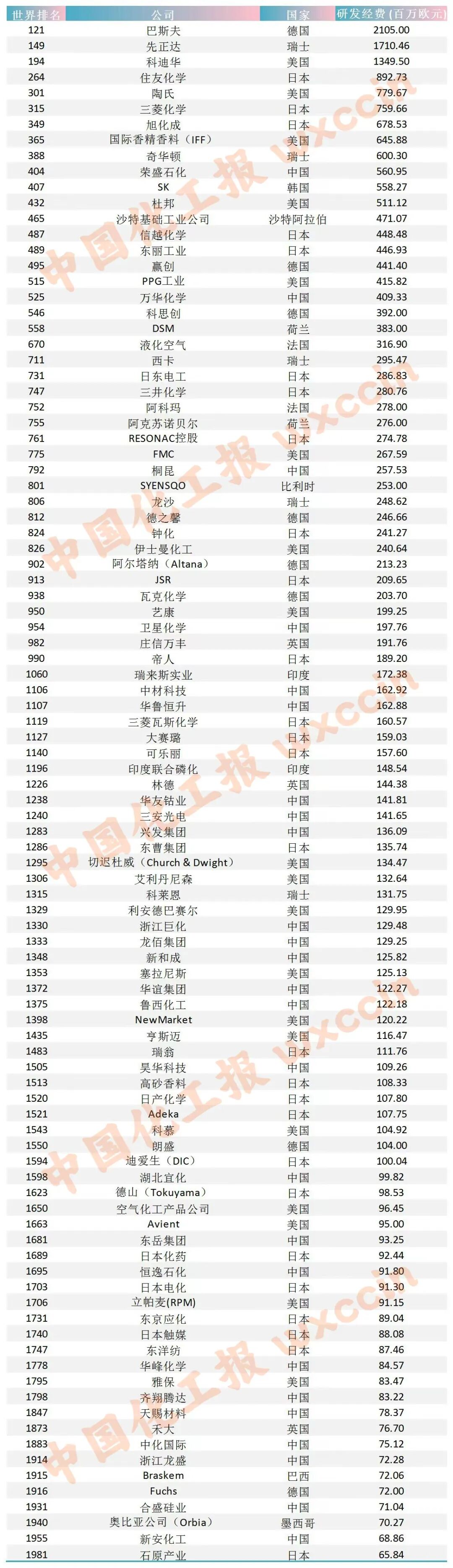 全球研发投入2000强化工企业名单 上榜的化企按国别分,日本27家,数量最多;中国25家,紧随其后;美国有19家、德国有8家、瑞士有5家。 报告显示,2000强企业2024年研发总投资额为1446亿欧元,占全球企业研发投资总额的90%以上。其中,674家企业来自美国,581家企业来自中国,318 家企业来自欧盟,192家企业来自日本。 排名前十强的企业分别是亚马逊、谷歌母公司ALPHABET、脸书母公司META、微软、苹果、华为、三星电子、大众汽车、强生和英特尔。 近日,欧盟委员会公布的《2025年欧盟工业研发投资记分牌》报告显示,25家中国化企进入2025年全球工业研发投入2000强。 根据报告,2000强中有98家化工企业,2024年研发投资总额为260亿欧元,平均每家化企投入1.32亿欧元。 巴斯夫继续领跑化工行业,2024年研发投入为21亿欧元,位列121名;先正达排名149位,研发投入为17.1亿欧元;科迪华位居194位,研发投入为13.4亿欧 元。排名4~10位的化企依次是住友化学、陶氏、三菱化学、旭化成、国际香料香精公司(IFF)、奇华顿。 | 世界排名 | 公司 | ■家 | 研发经费(百万欧 ...