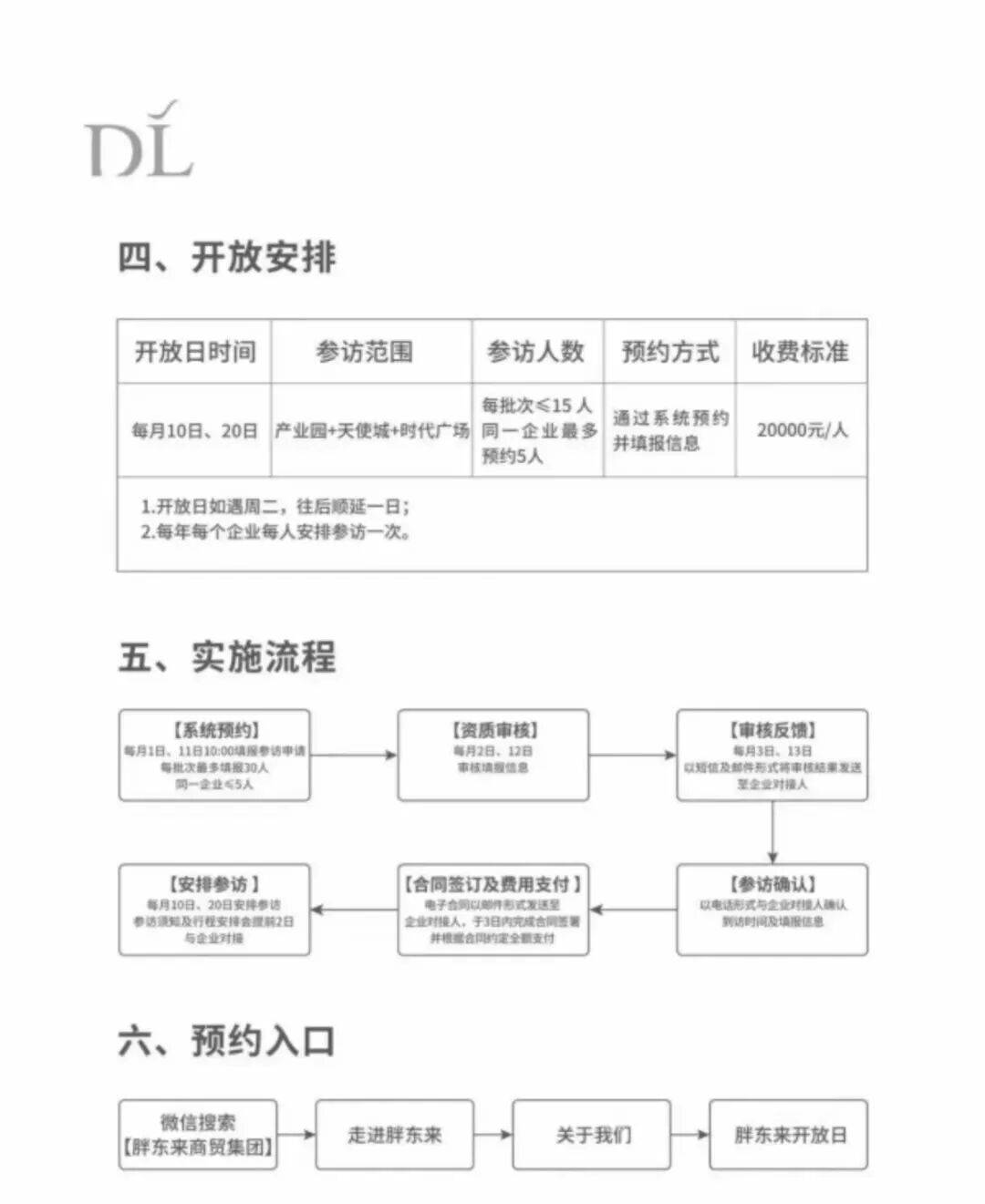 备受全国商业界关注的胖东来,即将向外界敞开大门。记者获悉,胖东来商贸集团将自 2025年11月1日起,正式推出"企业开放日",面向企业分享其备受推崇的经营理念与管理 方法。 值得注意的是,此次开放日并非免费"取经", 其收费标准为每人20000元。 | 开放日时间 | 参访范围 参访人数 | 预约方式 | 收费标准 | | --- | --- | --- | --- | | 每月10日、20日 | 每批次≤15人 产业园+天使城+时代广场 同一企业最多 预约5人 | 通过系统预约 并填报信息 | 20000元/人 | | 1.开放日如遇周二,往后顺延一日; 2.每年每个企业每人安排参访一次。 | | | | 五、实施流程 每月2场,每批次参访限15人 根据公布的方案,开放日活动定于每月10日与20日举办两场。为保证交流的深度与质量, 每批次的参访人数被严格限制在15人以内,且同一家企业的预约上限为5人;每月两场开放 日合计参访人数不超过30人。 参访地点将覆盖胖东来旗下的产业园、天使城及时代广场等核心业态,让参与者能深入一 线,直观感受其运营细节。另需注意,开放日如遇周二,将往后顺延一日。 四、开放安排 【资 ...