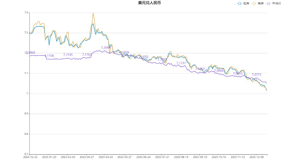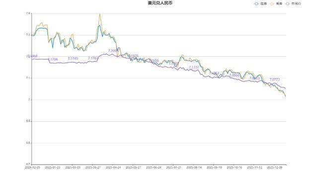 记者丨李益文 编辑丨叶映橙 视频丨王学全 临近年末,外汇市场波澜再起。 2025年12月25日,离岸人民币对美元汇率升穿7.0这一关键心理关口,最低触及6.99853元, 为2024年以来的首次。 与此同时,人民币对美元中间价连续调升,于25日报7.0392,同样 创 下逾一年新高。 回顾2025年全年,人民币对美元走出了 "先抑后扬、震荡走升" 的曲线。 年初,离岸人民币以7.27附近开局,随后受美联储"鹰派"立场影响,于4月8日触及年内低 点7.42879。 转折发生在下半年,随着美联储降息路径日益明晰,美元指数自高位回落,人民币随之走 强。 9月17日,离岸人民币突破7.1关口。 进入12月,升值步伐明显加快,12月15日单日下跌超百点,23日击穿7.02,最终在25日触 及6.99853的阶段性高点。 "7.0"这一整数关口,在人民币汇率历史上始终承载着重要的心理意义和技术意义。它不仅是 市场情绪的"温度计",也常常是衡量货币强弱转换的关键阈值。自2023年5月以来,人民币汇 率已持续在7.0上方运行逾一年半。此次年末强势叩关,无疑为市场增添了巨大悬念。 王青分析,年底临近,企业为满足财务核算、资金回 ...