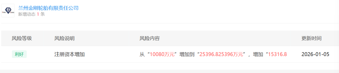西北老牌轮胎企业兰州金刚轮胎有限责任公司(以下简称"金刚轮胎")近期迎来重大战略转折。2026年1月5日,企业注册资本发生大幅变更,由1.008亿 元跃升至2.539亿元,增幅高达151.95%。这一资本运作的背景,是该公司总投资6.5亿元的改扩建项目取得实质性突破——搁置近二十年的全钢胎生产线 于2025年底全线贯通,首条全钢轮胎成功下线,标志着这家西北轮胎"独苗"正式按下"重启键"。 | 风险等级 | 风险说明 | 风险内容 | 更新时间 | | --- | --- | --- | --- | | 利好 | 注册资本增加 | 从"10080万元"增加到"25396.825396万元",增加"15316.8 | 2026-01-05 | 二十载曲折路,6.5亿激活"沉睡"资产 金刚轮胎成立于2002年,前身是甘肃省轮胎厂。早在2003年,其占地600亩的厂区便已启动建设,原规划年产100万条斜交胎和60万条全钢胎。然而,受多 重因素掣肘,其全钢胎项目在完成60%建设进度后陷入长达近二十年的停滞,企业主要依靠斜交胎生产及贴牌维持生存,错失了全钢胎发展的黄金期。 转折点出现在2023年。通过与中化二建集团有限公 ...