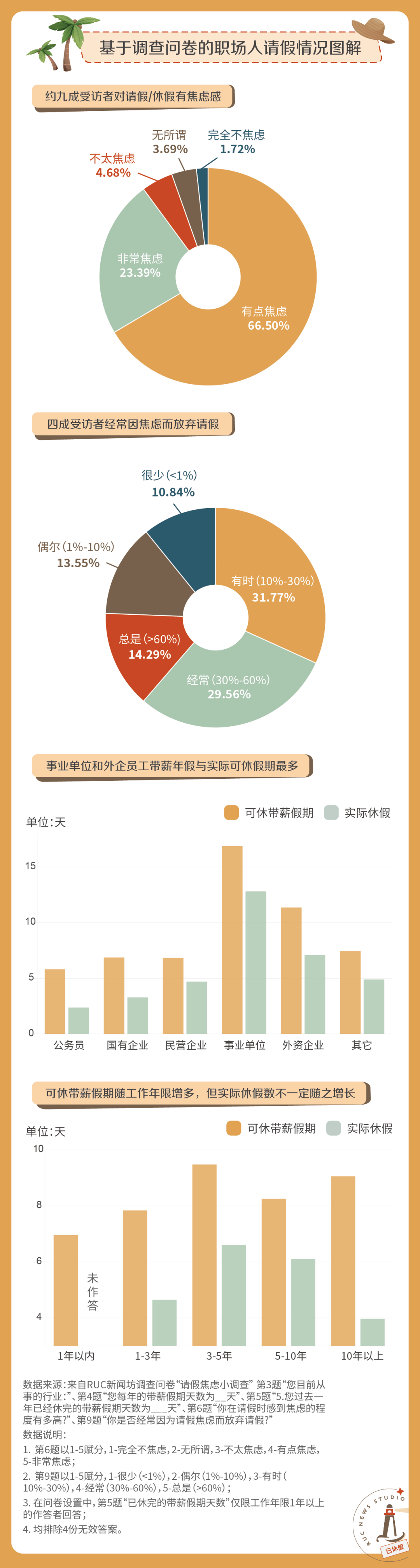 以下文章来源于RUC新闻坊 ,作者人大新闻系 RUC新闻坊 . 中国人民大学新闻学院新闻系运营的新闻采写编评及摄影业务教学与实践的平台。 当我们在讨论请假焦虑时,我们都在谈些什么? 一、能休吗?敢休吗? 请假焦虑并不是一种小众的困扰,在调查中, 近九成的人对请假感到"有点焦虑"甚至"非常焦虑"。 请假焦虑的一个直接表现是"放弃请假" ,问卷中近半数的人因焦虑"总是"或"经常"放弃休假。 在国企工作的菜菜痛经很严重,但为了不请假,她选择长期服用药物忍受,"虽然我所在的省有生理 假,但我不可能每次痛经都跑去医院开一个证明,我情愿通过吃药来解决这个事"。 本文来自微信公众号: RUC新闻坊 (ID:rendaxinwenxi) ,统筹:余婉遥,数据收集与分析:江 骁宇、张紫玉、余婉遥,可视化:禹琳、周熙然、余婉遥、胡美嬉,调查:胡美嬉、禹琳、周熙然, 文案:王睿歆、张紫玉、禹琳、江骁宇,美编:张紫玉,题图来自:AI生成 10月1日当天的火车票"点击即售罄",在互联网公司工作的荞麦纠结了好几天:相比于出行高峰的双 节假期,9月30日下午的火车票固然更好抢,但这也意味着她不得不请半天假。 "我已经两次把9月30日那辆车 ...
