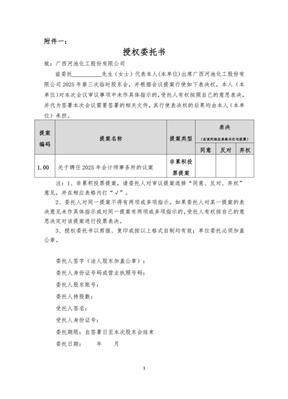 本公司及董事会全体成员保证信息披露内容的真实、准确和完整,没有虚假记载、误导性陈述或者重大 遗漏。 广西河池化工股份有限公司(以下简称"公司")第十一届董事会第四次会议通知于2025年11月17日以书 面和电子邮件的形式发出,会议于2025年11月21日在公司本部三楼会议室以现场及视频方式召开。会议 应到董事9人,实到董事9人。会议的召集和召开程序符合《中华人民共和国公司法》和《广西河池化工 | 一一年度 | | --- | | 授权委托书 | | 就:产悟网油包工股份有限公司: | | 编辑长 -- 北京(女士)饮费里人(年来位3创属广西网地处工股份有 | | 照会考试的事事三次看到胶系会,并根据会议资来行使如下表演议。本人《本 | | 承图 1对高次会议要以暴现利来的具体国际的,资讯人重权被照出己的意思表示。 | | 并代为后基本次会议管是签署的视系文件,实行使表决议的组集时由本人《出席 | | 位上基层/ | | BA 2 3 | | 展重看称 景宜昌节 TATERNERAREZERS! 11 | | 阿塞 反对 馬叔 | | 事業制設 1.00 关于调在2025年会计时事系所的认定 | | 黑傳畫 | ...