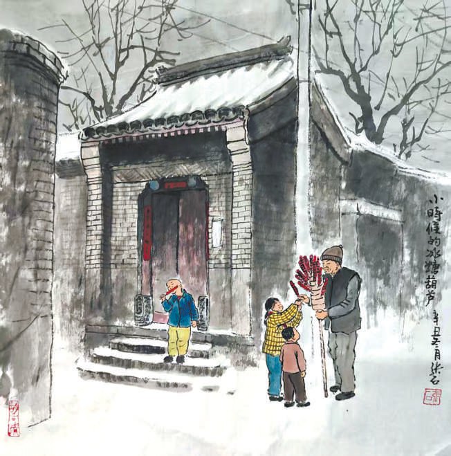 孔敏 冰糖葫芦的售卖方式除了商家摆放于柜台之中,还有街头小贩的挑担叫卖。当然,若论起制作和包装, 最为精致的大概还是梁实秋提到的信远斋,其在《酸梅汤与糖葫芦》中写道:"信远斋也卖蜜饯、冰糖 子儿、糖葫芦。以糖葫芦为最出色……东安市场所售较为高级。但仍以信远斋所制为最精,不用竹签, 每一颗山里红或海棠均单个独立,所用之果皆硕大无疵,而且干净,放在垫了油纸的纸盒中由客携 去。"选材精良,处理干净,但这种不用竹签儿的糖葫芦,似乎又缺少了食用时那种独特的游戏似的乐 趣。 张儒刚 绘 提到北京冬天应时当令的小吃,冰糖葫芦必须算一个。确实,再没有比冰糖葫芦跟北京的冬天更相得益 彰的零食了。这熬化的冰糖只能在北方寒冷的冬天才能冻得晶莹透亮、脆薄甘甜,咬一口,冰糖碎裂的 声音清脆悦耳。 北京西山盛产山里红,也称山楂、红果,这小小的红色果实看上去就温暖、喜庆,在萧瑟的冬天格外耀 眼。把圆滚滚的山里红用竹签穿起,就有了穿起团圆、圆满的好彩头。冰糖葫芦在天津称为"糖堆儿", 在济南叫"酸蘸儿",北京则给这种美食起了个顶好听的名字:"葫芦"。葫芦谐音"福禄",在中国向来是 富贵吉祥、平安幸福的象征。从视觉、味觉到听觉的享受,再加上这 ...