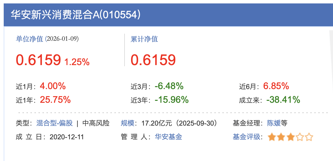 近日,A股市场迎来强劲上涨,沪深两大股指持续攀升,在权重股与热门板块的轮动带动下,指数上行获得有力支撑,众多跟踪大盘的基金产品也实现了显 著的净值增长。然而,在市场普遍向好的氛围中,华安基金旗下由知名基金经理陈媛管理的部分产品,其业绩表现却与市场整体走势出现明显背离。 最明显的当属成立于2020年12月11日的华安新兴消费混合A,发行期共募集62.68亿元,受到市场广泛关注,基金经理陈媛作为华安基金自主培养的消费投资 专家,也因其出色的业绩被称为"消费女神"。截至2026年1月9日,这只基金单位净值仅为0.6159元,自成立以来收益率为-38.41%,在同类基金中排名靠 后。 | 华安新兴消费混合A(010554) | | | | --- | --- | --- | | 单位净值(2026-01-09) | 累计净值 | | | 0.6159 1.25% | 0.6159 | | | 近1月: 4.00% | 近3月: -6.48% | 近6月: 6.85% | | 近1年: 25.75% | 近3年: -15.96% | 成立来: -38.41% | | 类型:混合型-偏股 中高风险 | 规模:17.20亿 ...