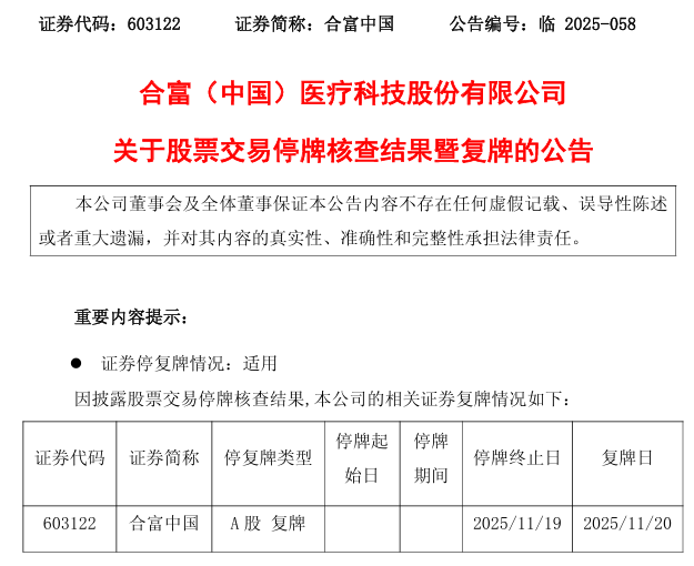 明日复牌。 合富中国(603122)11月19日晚间公告,近期,公司就股票交易异常波动及严重异常波动的相关事项进行了核查。鉴于相关核查 工作已完成,经公司向上海证券交易所申请,公司股票将于11月20日开市起复牌。经公司自查,公司目前日常经营活动一切正 常,公司内外部经营环境未发生重大变化。截至公告披露日,除了在指定媒体上已公开披露的信息外,不存在影响公司股票交易 价格异常波动的重大事宜;不存在其他涉及本公司应披露而未披露的重大信息;未发现可能或已经对公司股票交易价格产生影响 的媒体报道或市场传闻,亦未涉及热点概念事项。 | 证券代码 | 证券简称 | 停复牌类型 | 停牌起 | 停牌 | 停牌终止日 | 复牌日 | | --- | --- | --- | --- | --- | --- | --- | | | | | 始日 | 期间 | | | | 603122 | 合富中国 | A 股 复牌 | | | 2025/11/19 | 2025/11/20 | 公告显示,自2025年10月28日至2025年11月14日期间,公司股票连续14个交易日中有12个交易日以涨停价收盘,并5次触及股价 异常波动、3次触及严 ...