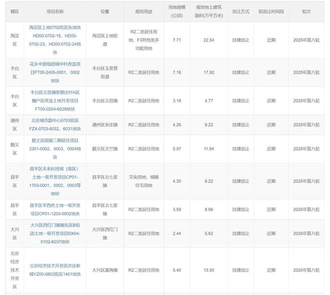 北京宅地,再上新。 10月16日,2025北京市第八轮拟供应商品住宅用地清单被公布。从北京规自委官网信息看,本轮拟供宅 地共有9宗,总土地面积约44万,总建筑规模约103万平米,这些地块都将在近期出让。 就区域分布上,呈"多点开花"。海淀区占据1宗,来自上地板块;丰台区有2宗,其中1宗位于三环外的 首经贸板块;其余的6宗则分别来自昌平区(2宗)、通州区(1宗)、顺义区(1宗)、大兴区(1 宗)、经济开发区(1宗)。 | 辅区 | 项目名称 | 位置 | 规划用途 | 用地规模 (公顷) | 规划地上建筑 面积(万平方米) | 出让方式 | 拟出让时间段 | 轮次 | | --- | --- | --- | --- | --- | --- | --- | --- | --- | | 海淀 区 | 海淀区上地0702街区东地块 HD00-0702-18, HD00- 0702-23, HD00-0702-24地 | 海淀区上地街 道 | R2二类居住用 地、F3其他类多 功能用地 | 7.71 | 22.64 | 挂牌出订 | 近期 | 2025年第八轮 | | | 15 | | | | | | | | | 非 ...