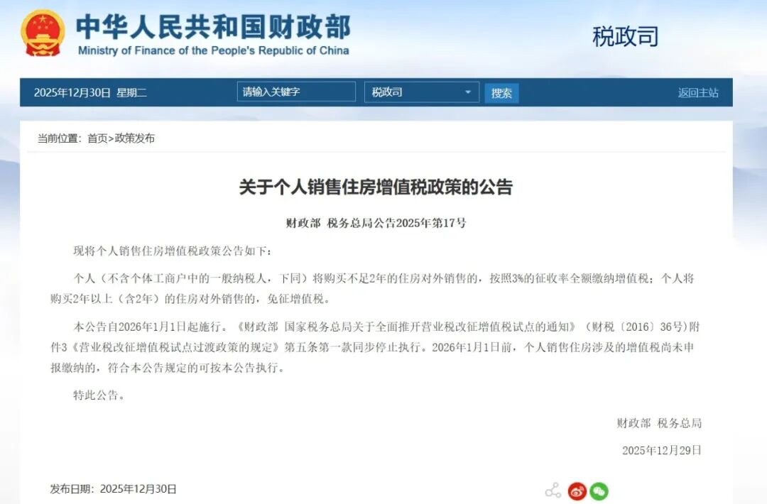 财政部网站12月30日消息,财政部、税务总局发布公告,个人(不含个体工商户中的一般纳税人,下同)将购买不足2年的住房对外销售的,按照3%的征收 率全额缴纳增值税;个人将购买2年以上(含2年)的住房对外销售的,免征增值税。 本公告自2026年1月1日起施行。《财政部 国家税务总局关于全面推开营业税改征增值税试点的通知》(财税〔2016〕36号)附件3《营业税改征增值税试点 过渡政策的规定》第五条第一款同步停止执行。 2026年1月1日前,个人销售住房涉及的增值税尚未申报缴纳的,符合本公告规定的可按本公告执行。 ...