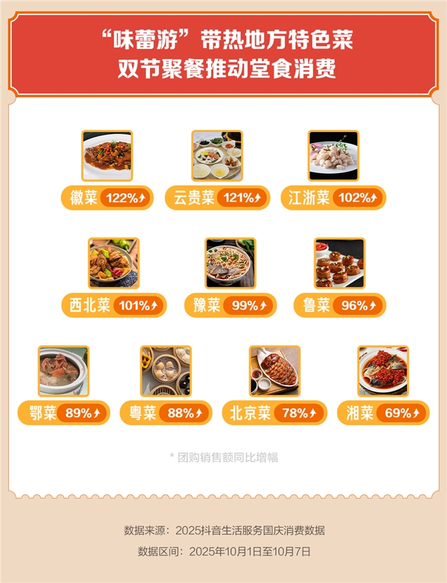 国庆“味蕾游”带热堂食消费,徽菜、云贵菜、江浙菜等抖音团购增长超100%
