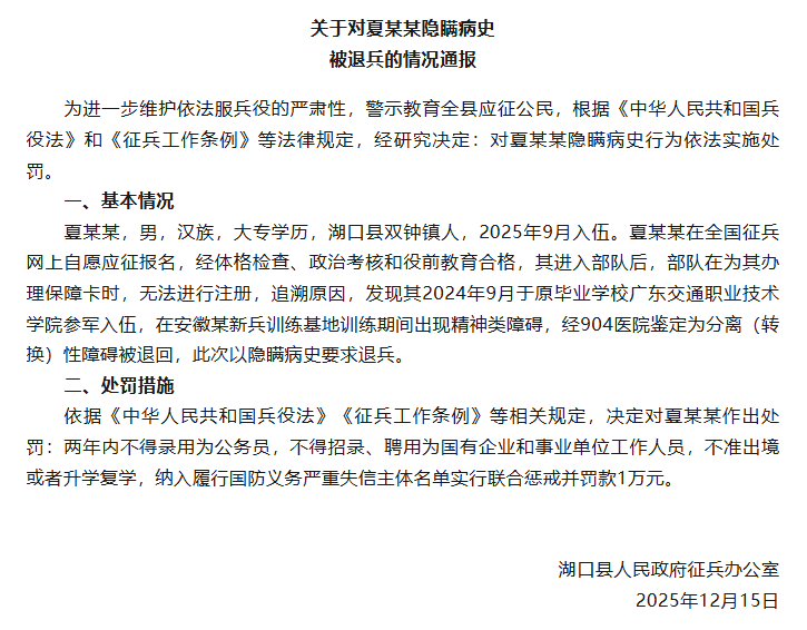 央视网消息:12月15日,江西九江湖口县人民政府征兵办公室发布关于对夏某某隐瞒病史被退兵的情况 通报: 为进一步维护依法服兵役的严肃性,警示教育全县应征公民,根据《中华人民共和国兵役法》和《征兵 工作条例》等法律规定,经研究决定:对夏某某隐瞒病史行为依法实施处罚。 一、基本情况 夏某某,男,汉族,大专学历,湖口县双钟镇人,2025年9月入伍。夏某某在全国征兵网上自愿应征报 名,经体格检查、政治考核和役前教育合格,其进入部队后,部队在为其办理保障卡时,无法进行注 册,追溯原因,发现其2024年9月于原毕业学校广东交通职业技术学院参军入伍,在安徽某新兵训练基 地训练期间出现精神类障碍,经904医院鉴定为分离(转换)性障碍被退回,此次以隐瞒病史要求退 兵。 二、处罚措施 依据《中华人民共和国兵役法》《征兵工作条例》等相关规定,决定对夏某某作出处罚:两年内不得录 用为公务员,不得招录、聘用为国有企业和事业单位工作人员,不准出境或者升学复学,纳入履行国防 义务严重失信主体名单实行联合惩戒并罚款1万元。 ...