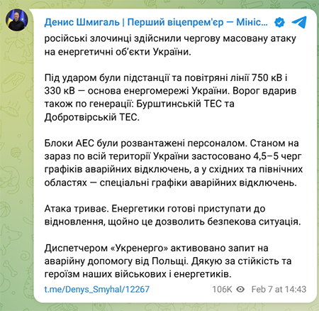 当地时间2月7日,乌克兰国家电力公司和乌克兰第一副总理兼能源部长什梅加尔在Telegram发帖称,俄 罗斯再次对乌克兰能源基础设施发动了新一轮"大规模袭击"。目前,俄罗斯方面对此事尚无具体回应。 什梅加尔说,"俄军此次袭击的目标直指乌克兰电力系统的骨干网络,包括750千伏和330千伏的高压变 电站及输电线路。此外,布尔什廷热电厂(Burshtyn TES)和多布罗特维尔热电厂(Dobrotvir TES)等 核心发电设施也遭到了打击。" "截至目前,乌克兰全境已采取4、5轮紧急限电措施,东部和北部灾情较重的各州则已启动特殊紧急停 电方案。"并且,为了应对袭击引发的电网电压波动,什梅加尔表示"目前乌克兰境内各核电站机组已实 施降负荷运行"。 什梅加尔声称,乌克兰的能源技术工人目前已严阵以待,将在安全形势允许的第一时间开展修复工作。 与此同时,由于电力缺口巨大,乌方已正式向波兰请求紧急电力援助。 Telegram 另一方面,俄罗斯国防部等部门曾多次称对乌能源设施的打击是为回应乌方对俄民用目标的袭击。俄罗 斯国防部3日通报称,为回应乌克兰对俄境内民用目标的恐怖袭击,俄武装部队3日凌晨使用远程陆基和 空基精确制导武器 ...