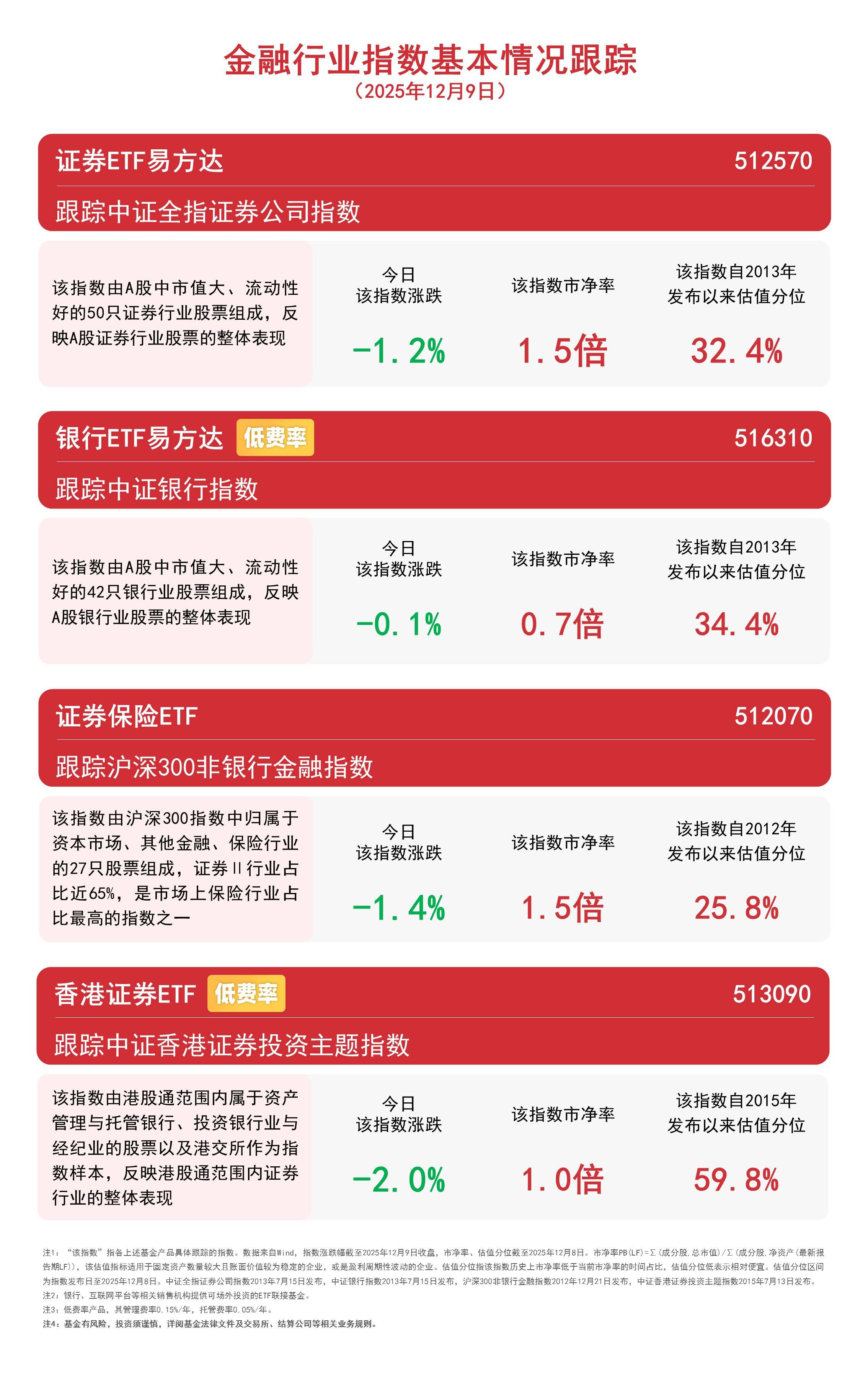 今日,非银板块在连涨三日后迎来回调,银行板块则延续窄幅震荡。指数层面,中证银行指数下跌0.1%,中证全指证券公司指数下跌1.2%,沪深300非银行 金融指数下跌1.4%,香港证券指数下跌2.0%。 平安证券指出,国家金融监督管理总局发布的《关于调整保险公司相关业务风险因子的通知》下调了沪深300、红利低波和科创板等长期持仓资产风险因 子,有助于培育耐心资本并支持科技创新。该政策的实施有望持续推动中长期资金入市,提升保险资金的权益配置能力。 跟踪沪深300非银行金融指数 该指数由沪深300指数中归属于 资本市场、其他金融、保险行业 的27只股票组成,证券Ⅱ行业占 比近65%,是市场上保险行业占 比最高的指数之一 该指数出A胶甲巾倡天、流列性 好的42只银行业股票组成,反映 A股银行业股票的整体表现 0-1 证券保险ETF ▽日 该指数法 香港证券ETF 低费率 跟踪中证香港证券投资主题指数 该指数由港股通范围内属于资产 管理与托管银行、投资银行业与 经纪业的股票以及港交所作为指 数样木 反映法股通节周内证券 该指数准 令日 该指数泪 每日经济新闻 ...