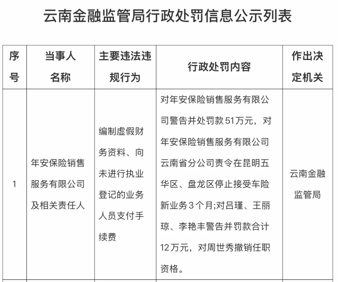 云南金融监管局对年安保险销售服务有限公司警告并处罚款51万元,对年安保险销售服务有限公司云南省分公司责令在昆明五华区、盘龙区停止接受车险 新业务3个月;对吕瑾、王丽琼、李艳丰警告并罚款合计12万元,对周世秀撤销任职资格。 年安保险销售服务有限公司是2006年1月经批准成立的全国性保险代理机构,法定代表人为吕瑾。公司在全国范围内设有分支机构,经营范围涵盖保险产 品代理销售、保险费代收、保险理赔勘查等业务。 | 序 | 当事人 | 主要起法违 | 行政处罚内容 | 作出决 | | --- | --- | --- | --- | --- | | 를 | 名称 | 规行为 | | 定机关 | | 1 | 年安保险销售 | 编制虚假财 | 对年安保险销售服务有限公 年安保险销售服务有限公司 云南省分公司责令在昆明五 | | | | | | 司警告并处罚款51万元,对 | | | | | 务资料、向 | | | | | | 未进行执业 | | 電影圖 | | | 服务有限公司 | | 华区、盘龙区停止接受车险 | | | | | 登记的业务 | | 监管局 | | | 及相关责任人 | | 新业务3个月;对吕瑾、王丽 | ...