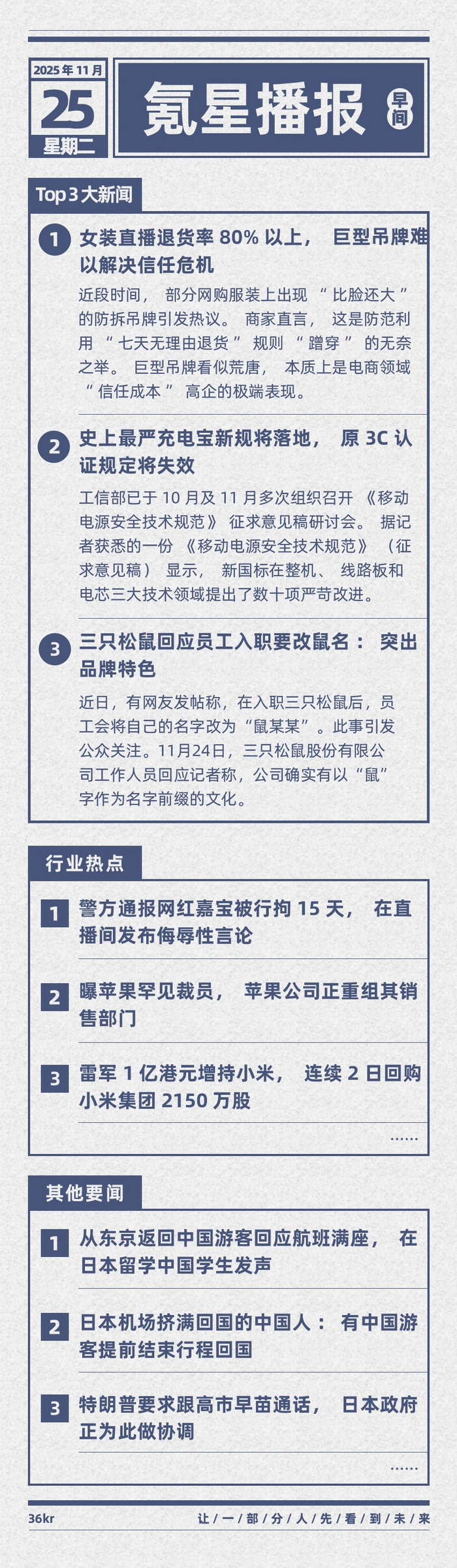 【#氪星播报#|11月25日早间都有哪些#今日大事件#?】 1、#警方通报网红嘉宝被行拘15天#,在直播间发布侮辱性言论 2、#曝苹果罕见裁员#,苹果公司正重组其销售部门 3、#雷军1亿港元增持小米#,连续2日回购小米集团2150万股 4、#神舟二十二号飞船即将实施发射#,在我国酒泉卫星发射中心实施发射 5、#消息称iPhoneFold已实现无折痕设计#,鸿海已建立折叠iPhone专属生产线 [星星]Top3大新闻 1、#女装直播退货率80%以上#,巨型吊牌难以解决信任危机 2、#史上最严充电宝新规将落地#,原3C认证规定将失效 3、#三只松鼠回应员工入职要改鼠名#:突出品牌特色 [星星]科技财经互联网热点 2、#日本机场挤满回国的中国人#:有中国游客提前结束行程回国 3、#特朗普要求跟高市早苗通话#,日本政府正为此做协调 4、#法国民众冒雨送别大熊猫回家#,旅法大熊猫欢欢因健康原因月底回国 5、#台拟放宽近亲结婚引争议#,医学界齐声反对 6、#日本大分火灾持续一周仍未被扑灭#,已致超170栋建筑被烧 安装直播退货率 80%以上, 早些荷牌难 T 以解决信任危机 近段时间,部分网购服装上出现"比脸还大" 的防 ...