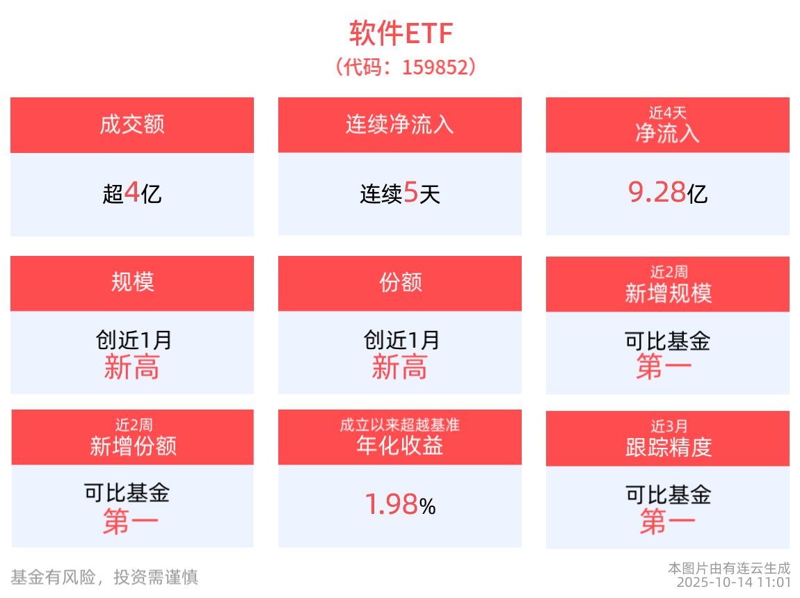 截至2025年10月14日 11:01,中证软件服务指数下跌1.91%。成分股方面涨跌互现,财富趋势领涨1.35%,同花顺上涨0.84%,航天信息上涨0.12%;金山办公 领跌,电科数字、中国软件跟跌。软件ETF(159852)回调整固。 流动性方面,软件ETF盘中换手7.01%,成交4.05亿元。规模方面,软件ETF最新规模达57.93亿元,创近1月新高,位居可比基金第一。份额方面,软件ETF 最新份额达61.65亿份,创近1月新高,位居可比基金第一。 从资金净流入方面来看,软件ETF近5天获得连续资金净流入,最高单日获得5.07亿元净流入,合计"吸金"9.37亿元。 东吴证券表示,预计信创即将迎来招标行情,2025年是政府信创未来三年的关键一年,规模较大。同时,随着美国方面对华科技限制或加剧,AI软件自主 可控产业有望迎来加速发展。 | 股票代码 | 股票简称 | 涨跌幅 | 权重 | | --- | --- | --- | --- | | 002230 | 科大讯飞 | -2.42% | 13.93% | | 688111 | 金山办公 | -5.02% | 8.15% | | 300033 | 同花顺 ...
