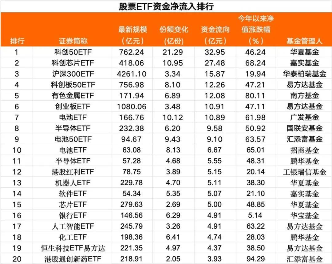 10月10日(上周五),A股市场迎来显著调整,三大指数集体收跌,前期热门赛道股回调明显,创业板指跌幅更是超过4.5%,两市成交约2.52万亿元。 急跌行情下,部分资金选择入场。 股票ETF市场资金流向数据显示,上周五股票ETF资金净流入超300亿元,科创50ETF、创业板ETF等宽基ETF,以及半导体、电池、有色等行业ETF产品 资金净流入居前;中证A500ETF、中证1000ETF等宽基ETF,以及自由现金流、通信等行业主题ETF净流出较多。 华夏基金旗下ETF中,10月10日,科创50ETF和机器人ETF单日净流入居前,分别净流入32.95亿元和5.11亿元,最新规模分别达762.24亿元和229.78亿元, 对应跟踪指数近一月日均成交额分别为62.34亿元和20.37亿元。芯片ETF净流入5亿元,有色金属ETF华夏、新能源车ETF、科创人工智能ETF华夏净流入 都超3亿元。 部分宽基ETF净流出居前 10月10日,部分股票ETF整体净流出资金较多。 上周五股票ETF净流入超300亿元 据Wind数据统计,截至10月10日,全市场1224只股票ETF(含跨境ETF)总规模为4.59万亿元。 股票ETF资金 ...