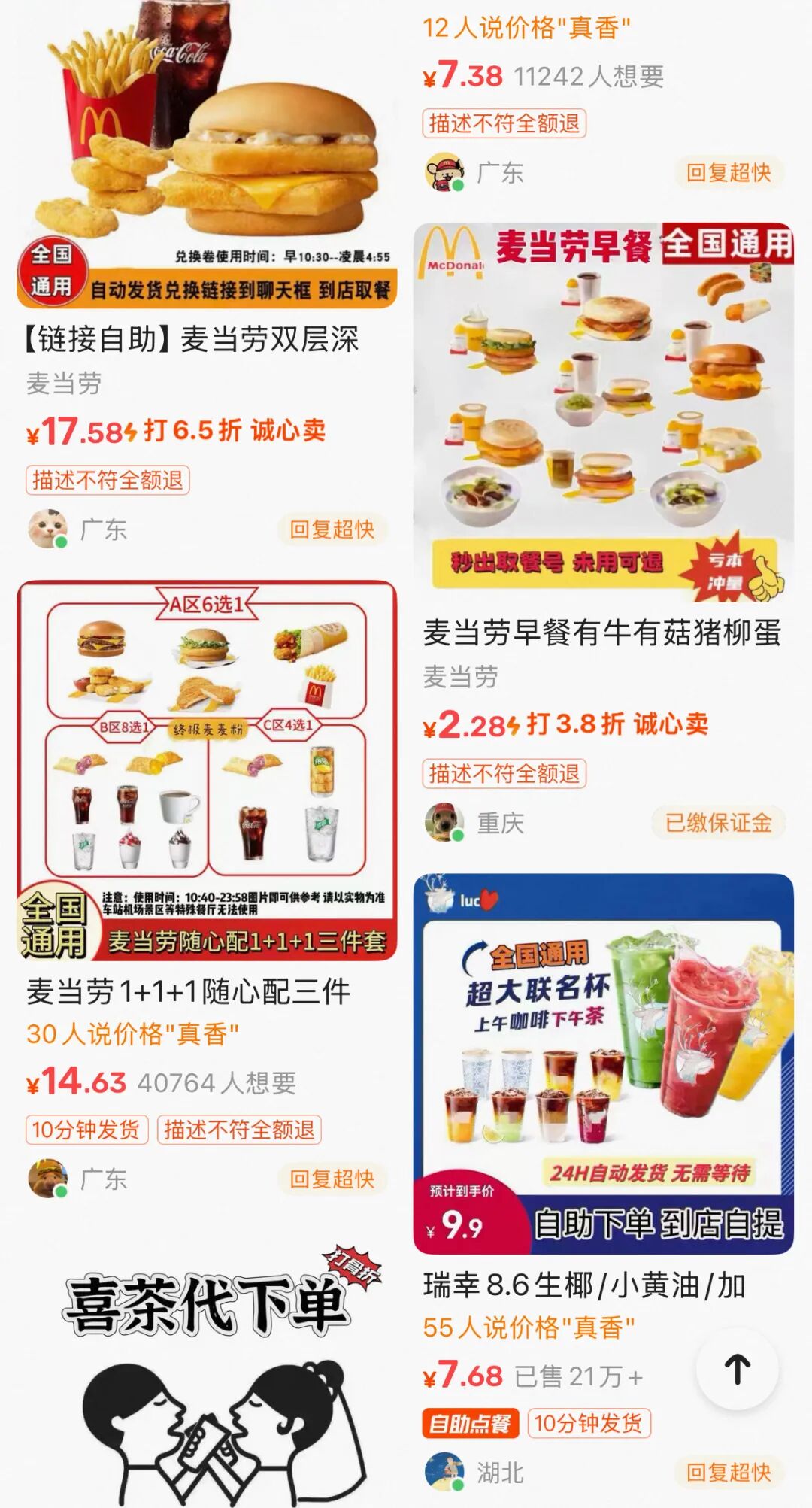 某种程度上,"代下单"模式确实重塑了我们的生活。下班了想去看一场电影,先看看"代下单"有无便宜的电影票。周末去哪儿?发现植物园有 便宜了20元的门票,说去就去。肩颈疼痛难忍,看到"代下单"很划算,原本准备自我拉伸修复的,也立马改成去躺平按摩……每个生活在大城 市、经济实力有限却又渴望维持一定消费水准的年轻人大概都有这样的体会。而"代下单"的出现,则刚好让我们维持着一种购买力尚可、生活 依然秀色可餐的幻觉。 使用"代下单",似乎只有0次和无数次。 在当下,"代下单"已经成为都市生活的一项必备技能。在各大电商平台、社交媒体上搜索"代下单",便会打开一个省钱的新世界——你只需用低于原价甚 至骨折价的价格,就可以购买一模一样的产品和服务。 原价43元的香辣鸡腿堡三件套,只要花几分钟在手机划拉几下,就能以21元的价格拿下;想看电影,原价49元的票,几步操作后只需要19元……从吃饭、 喝饮料、游玩、推拿,再到停车、住酒店等生活服务,几乎没有"代下单"尚未涉足的消费领域。 某平台上的"代下单"产品。(图/购物平台截图) 随着越来越多人开始习惯这样"去差价"的消费方式,"代下单"也成为了一条产业链,催生了无数人的副业。 01 ...