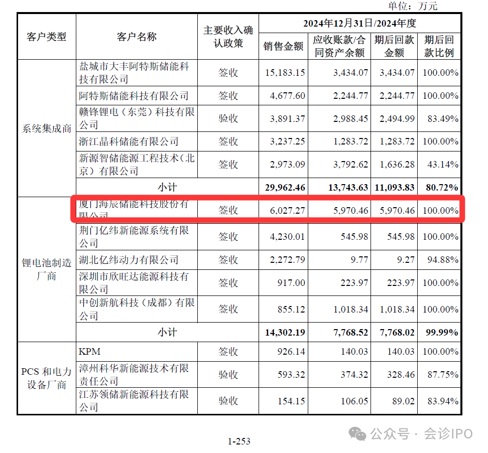 (一)对海辰储能销售金额与问询函与招股书不一致,真实性存疑 高特电子第一轮问询函P253页披露,对海辰储能销售金额6027.27万。 | | | | | | 单位: 万元 | | | --- | --- | --- | --- | --- | --- | --- | | 客户类型 | 客户名称 | 主要收入确 | | 2024年12月31日/2024年度 | | | | | | 认政策 | 销售金额 | 应收账款/合 | 期后回款 | 期后回 | | | | | | 同资产余额 | 金额 | 款比例 | | 技有限公司 | 盐城市大丰阿特斯储能科 阿特斯储能科技有限公司 | 签收 签收 | 15.183.15 4.677.60 | 3.434.07 2.244.77 | 3.434.07 2.244.77 | 100.00% 100.00% | | | 赣锋锂电(东莞)科技有限 | 验收 | 3.891.37 | 2.988.45 | 2.494.99 | 83.49% | | 系统集成商 | 公司 | | | | | | | | 浙江晶科储能有限公司 | 答收 | 3.237.25 | 1.283.72 | ...