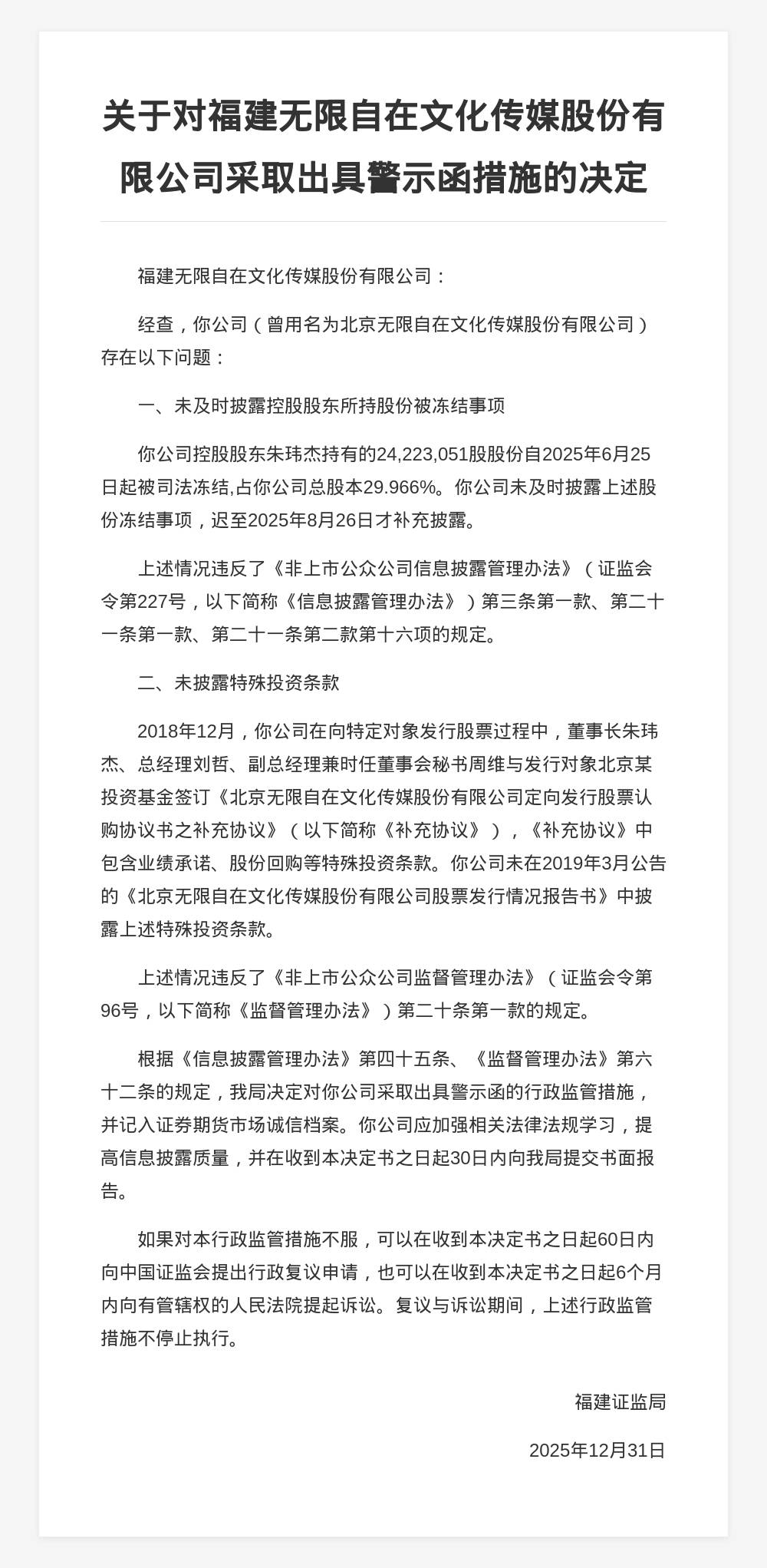 福建无限自在文化传媒被出具警示函,涉未及时披露股份冻结及特殊投资条款