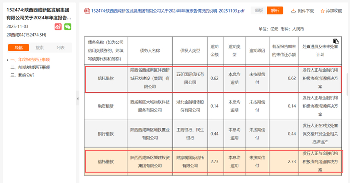 Core Viewpoint - The trust industry is currently undergoing risk resolution, with several companies, including Xixian Group, disclosing overdue trust loans, indicating ongoing challenges in managing non-standard projects due to rapid past expansion [1][2][10]. Company Summary - Xixian Group, established in September 2011 with a registered capital of 30 billion RMB, has two subsidiaries that reported overdue trust loans totaling 0.62 billion RMB and 2.73 billion RMB [2]. - The overdue loans are linked to Xixian Group's subsidiaries, with one loan from Shaanxi Xixian New Area Fengxi New City Development and Construction Group Co., Ltd. to Wukuang Trust, and another from Shaanxi Xixian New Area Urban Construction Investment Group Co., Ltd. to Lujiazui Trust [1][2]. Industry Summary - The trust industry is experiencing a shift as the most concentrated phase of risk exposure has passed, but the resolution of existing risks remains a gradual process [1][10]. - In the first ten months of this year, the number of defaults in government financing trust products was 9, with a total default scale of 1.602 billion RMB, compared to 40 defaults and 6.924 billion RMB in the same period last year [10]. - Trust companies are exploring market-oriented risk resolution methods, such as introducing strategic investors and seeking third-party institutions to acquire investor rights, to achieve risk isolation and smooth exit from projects [10].