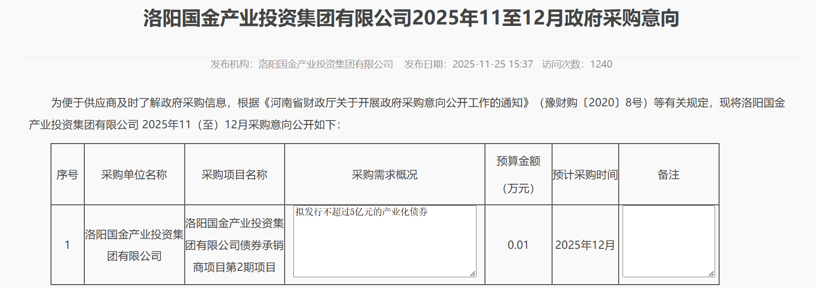 洛阳国金产投集团发布采购意向:拟发行5亿元产业化债券