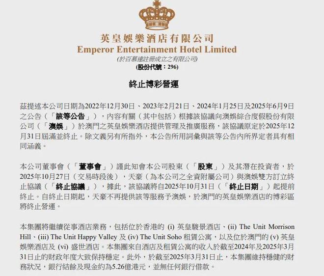 Core Viewpoint - Emperor Entertainment Hotel (00296.HK) announced the termination of its gaming operations at the Emperor Palace Casino, effective October 30, 2023, following an agreement with SJM Holdings [1][6][8]. Group 1: Termination of Operations - The Emperor Palace Casino ceased operations at 23:59 on October 30, 2023, as part of a mutual agreement between Emperor Entertainment's subsidiary, Tianhao, and SJM Holdings [6][8]. - This decision follows SJM Holdings' earlier announcement on June 9, 2023, regarding the discontinuation of gaming operations at several satellite casinos, including the Emperor Palace Casino [5][6]. Group 2: Financial Performance and Debt Issues - Emperor Entertainment Hotel reported a revenue of approximately HKD 1.2 billion for the fiscal year ending March 31, 2007, indicating strong initial performance [8]. - The company is currently facing significant financial challenges, with HKD 16.6 billion in overdue loans, raising concerns about its ongoing viability [15]. - Emperor International (00163.HK) reported total revenue of HKD 1.376 billion for the fiscal year 2024-2025, a 41.5% increase year-on-year, but also saw losses increase from HKD 20.28 billion to HKD 48.4 billion, a 138% rise [12][14]. Group 3: Future Business Direction - Despite the termination of gaming operations, Emperor Entertainment Hotel will continue its hotel business, including properties like the Emperor Scenic Hotel in Hong Kong [8]. - The company aims to maintain stable income from hotel and rental apartment operations for the fiscal years ending March 31, 2024, and 2025 [8].