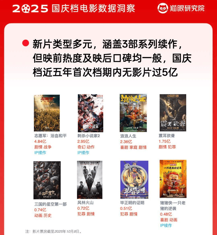 交通运输部10月8日发布的数据显示,国庆中秋假期,全社会跨区域人员流动量预计达24.32亿人次,日均超3亿人次,同比增长6.2%,创历史同期新高。 业内人士表示,当前旅游消费方式更趋多元,错峰出行、分段度假、深度体验等新形态逐渐普及。这些变化显示出中国旅游市场正向"品质升级"转变。 电影票房整体表现不算亮眼,统计数据显示,2025年国庆档电影票房为18.35亿元,比去年的七天国庆档(21.05亿)下跌13%;观影人次为5007.9万,同 比下降4%;平均票价为36.6元,较去年同期的40.4元下降9%,平均票价下调至近5年最低。此外,值得关注的是,国庆档新片数量多达十部,涵盖战争、 奇幻、喜剧、犯罪等多元类型,且涵盖3部系列续作但映前热度及映后口碑均一般,国庆档近五年首次档期内无影片过5亿。 图源:猫眼专业版 再将目光聚焦至文旅消费目的地,综合美团旅行、携程数据报告,其出行订单同比增长3%-30%,北京、成都、上海、西安、重庆、武汉、深圳、广州、 青岛、南京、杭州、长沙、洛阳等10余座城市入围国内热门旅游目的地Top榜单。 不难看出,上述热门目的地均是知名网红旅游城市或经济活力城市的代表,其假日消费数据颇具看 ...