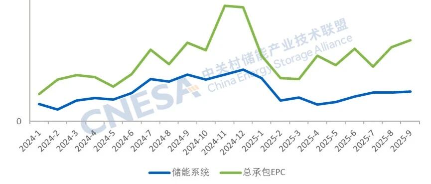 文 | 中关村储能产业技术联盟 中关村储能产业技术联盟始终以及时全面的标准,持续追踪储能招中标项目信息,依托扎实的数据积 累与专业研判,联盟定期输出针对储能招中标市场的客观分析,为产业同仁提供市场参考。自8月 起,月度分析细化为招标、中标市场两篇,本期聚焦9月招标市场。 9月招标市场速览: 2 02 5年9月,中关村储能产业技术联盟基于各大招采平台发布的公开信息,追踪到储能招标 标 段 2 4 7 条 ( 同 比 - 7 .8% , 环 比 +4.2% ) , 涵 盖 总 承 包 EPC 、 储 能 系 统 、 储 能 电 芯 、 电 池 Pa c k、PCS、EMS、BMS等全链条环节。 01 招标标段数(不含集采/框采) 环比均呈波动上升趋势 图1:2024年1月-2025年9月储能系统和EPC的月度招标标段趋势(单位:条) 注:不含集采/框采 数据来源:CNESA Datalink全球储能数据库 https://www.esresearch.com.cn/ 02 招标规模(含集采/招采) EPC招标能量规模创历史新高 储能系统招标规模2. 9GW/ 9.3GWh,同比+58 .4%/+12 5.3%,环 ...