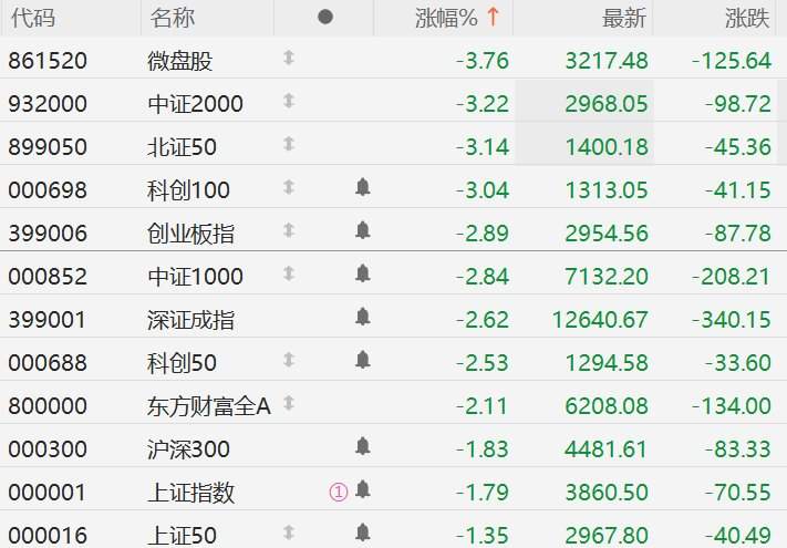 | 代码 | 名标 | | | 涨幅%↑ | 最新 | 涨跌 | | --- | --- | --- | --- | --- | --- | --- | | 861520 | 微盘股 | 1 | | -3.76 | 3217.48 | -125.64 | | 932000 | 中证2000 | 2 | | -3.22 | 2968.05 | -98.72 | | 899050 | 北证50 | 1 | | -3.14 | 1400.18 | -45.36 | | 000698 | 科创100 | 1 | 喜 | -3.04 | 1313.05 | -41.15 | | 399006 | 创业板指 | 2 | 看 | -2.89 | 2954.56 | -87.78 | | 000852 | 中证1000 | 1 | 1 | -2.84 | 7132.20 | -208.21 | | 399001 | 深证成指 | | 章 | -2.62 | 12640.67 | -340.15 | | 000688 | 科创50 | 1 | 0 | -2.53 | 1294.58 | -33.60 | | 800000 | ...