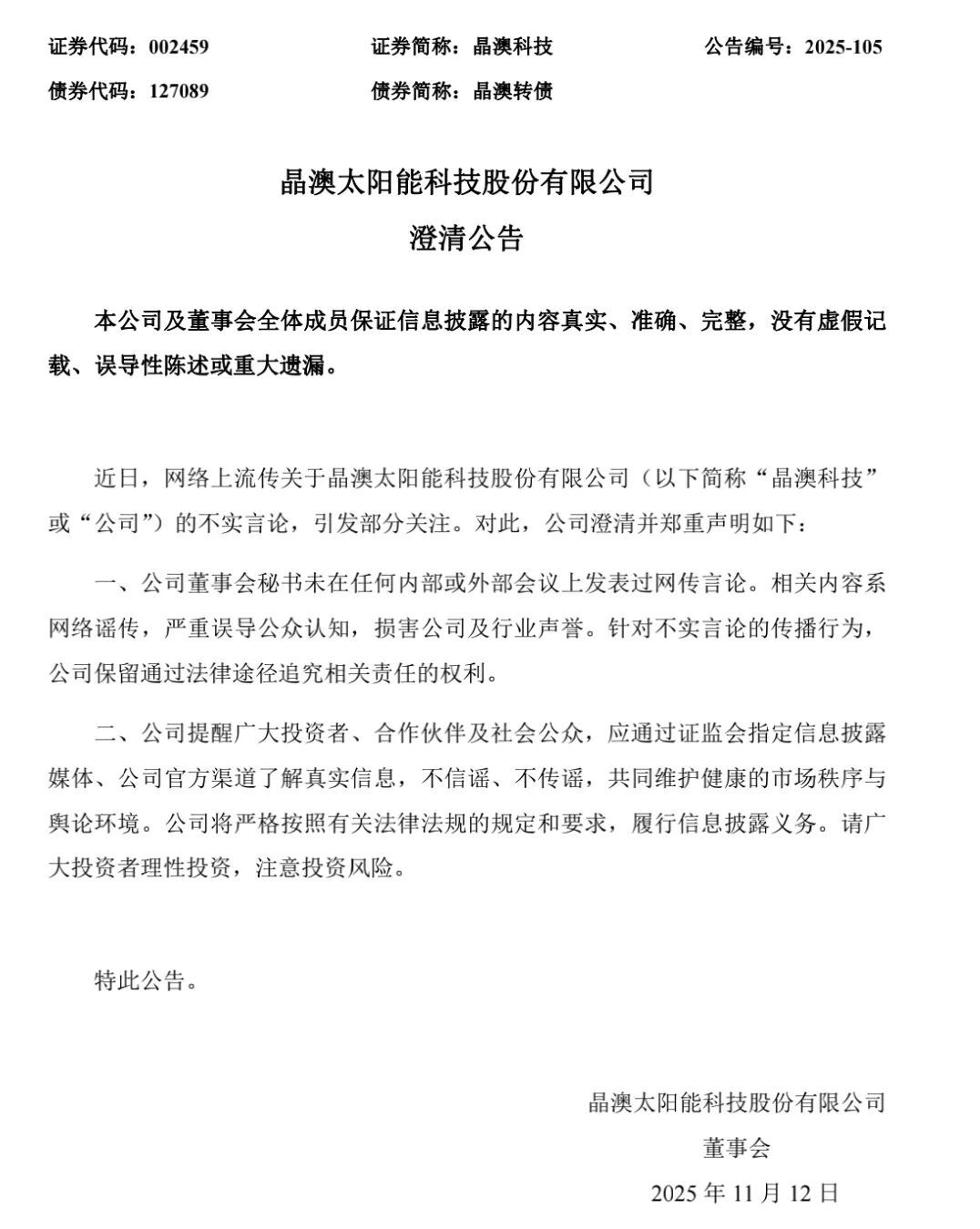 11月12日晚间,晶澳科技发布澄清公告称,网络上流传关于公司的不实言论,引发部分关注。对此,公司澄清并郑重声明如下:公司董事会秘书未在任何 内部或外部会议上发表过网传言论。相关内容系网络谣传,严重误导公众认知,损害公司及行业声誉。针对不实言论的传播行为,公司保留通过法律途径 追究相关责任的权利。 | 证券代码:002459 | 证券简称:晶澳科技 | 公告编号:2025-105 | | --- | --- | --- | | 债券代码:127089 | 倩券简称:晶澳娃倩 | | 晶澳科技相关工作人员回复《每日经济新闻》记者表示:"公司始终坚定看好并充分相信,光伏行业反'内卷'的相关政策必将落地实施,并将积极支持和 配合各项工作。我们真诚期待并支持收储平台能够顺利建立并发挥作用。同时,我们也认识到,平台的具体落地实施过程中,仍需各方协同,共同克服一 系列现实挑战,推动行业健康发展。" (声明:文章内容和数据仅供参考,不构成投资建议。投资者据此操作,风险自担。) 此前,市场有消息称,晶澳科技董秘在光伏一月度例会中表示"收储"平台黄了,并被进一步解读为"反内卷"失败。 该消息广泛传播后,今日A股光伏板块应声大跌。 ...