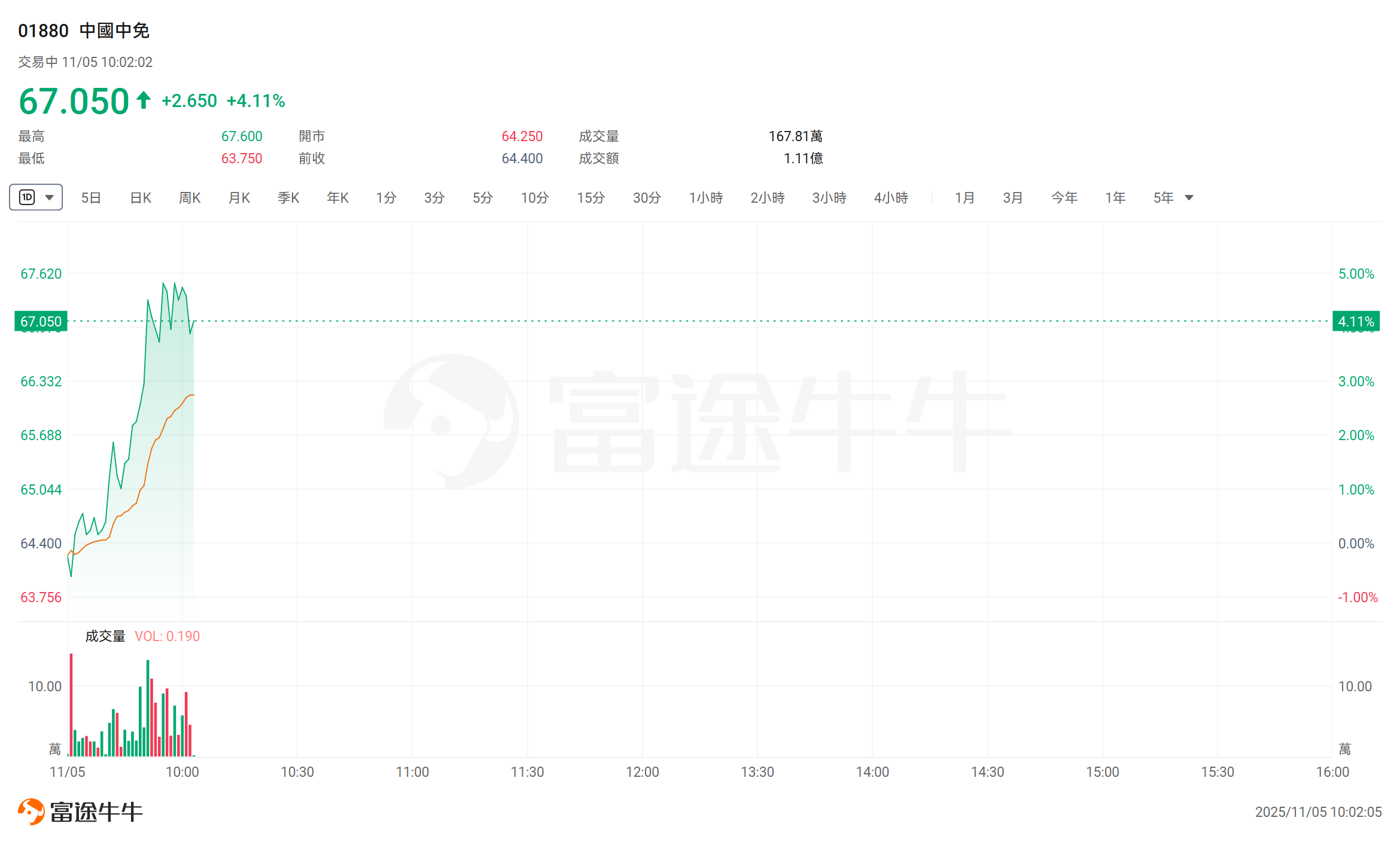 港股异动 | 中国中免(01880)逆市涨超4% 公司首次中期分红 近期多项政策出台有望推动免税行业增长